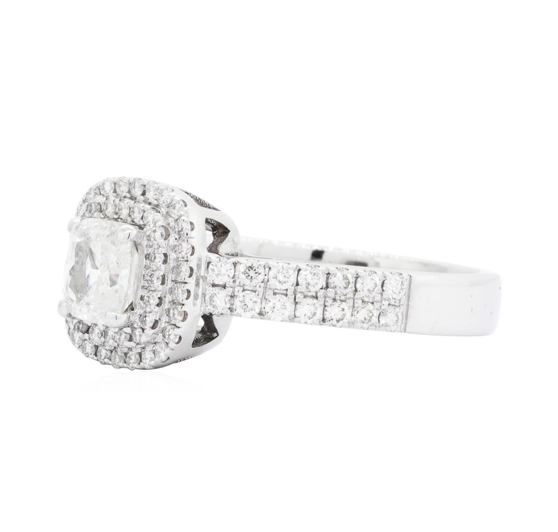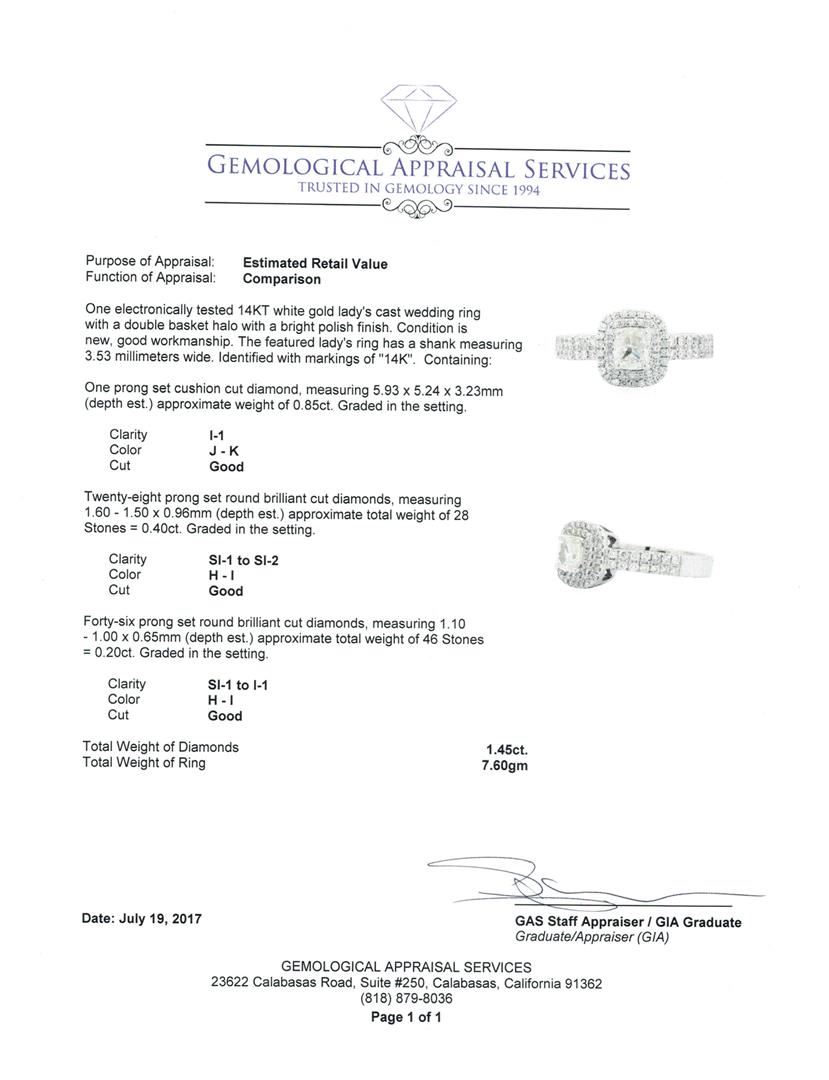One electronically tested 14KT white gold Ladies cast wedding ring with a double basket halo with a bright polish finish. The featured Ladies ring has a shank measuring 3.53 millimeters wide. Identified with markings of '14K'. Condition is new, good workmanship. Containing: One prong set cushion cut diamond, measuring 5.93 x 5.24 x 3.23mm (depth est.) approximate weight of 0.85ct. Graded in the setting. Color J - K Clarity I-1 Cut Good Twenty-Eight prong set round brilliant cut diamonds, measuring 1.60 - 1.50 x 0.96mm (depth est.) approximate total weight of 28 Stones = 0.40ct. Graded in the setting. Color H - I Clarity SI-1 to SI-2 Cut Good Forty-Six prong set round brilliant cut diamonds, measuring 1.10 - 1.00 x 0.65mm (depth est.) approximate total weight of 46 Stones = 0.20ct. Graded in the setting. Color H - I Clarity SI-1 to I-1 Cut Good. Total Weight of Diamonds 1.45ct. Total Weight of Ring 7.60gm. GAS Appraised.
