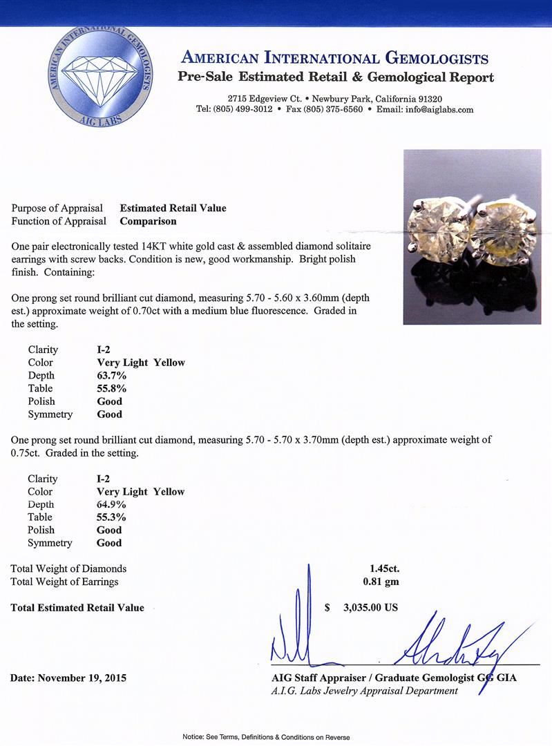 One pair electronically tested 14KT white gold cast & assembled diamond solitaire earrings with screw backs. Condition is new, good workmanship. Containing: One prong set round brilliant cut diamond, measuring 5.70 - 5.60 x 3.60mm (depth est.) approximate weight of 0.70ct with a medium blue fluorescence. Graded in the setting. Clarity: I-2. Depth: 63.7%. Table 55.8%. One prong set round brilliant cut diamond, measuring 5.70 - 5.70 x 3.70mm (depth est.) approximate weight of 0.74ct. Graded in the setting. Clarity: I-2. Depth: 64.9%. Table 55.3%. Total Weight of Diamonds 1.44ct. Total Weight of Earrings 0.99gm. AIG Appraised at $3,040.00.