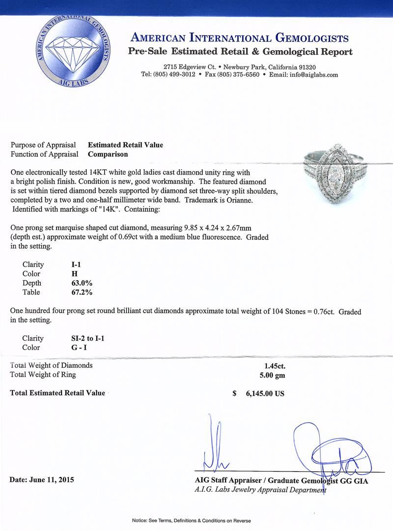 One electronically tested 14KT white gold ladies cast diamond unity ring with a bright polish finish. The featured diamond is set within tiered diamond bezels supported by diamond set three-way split shoulders, completed by a two and one-half millimeter wide band. Trademark is Orianne. Identified with markings of "14K". Condition is new, good workmanship. Containing: One prong set marquise shaped cut diamond, measuring 9.85 x 4.24 x 2.67mm (depth est.) approximate weight of 0.69ct with a medium blue fluorescence. Graded in the setting. Clarity: I-1. Color: HDepth 63.0%. Table 67.2%. One Hundred Four prong set round brilliant cut diamonds approximate. Total Weight of 104 Stones = 0.76ct. Graded in the setting. Clarity: SI-2 to I-1. Color: G - I. Total Weight of Diamonds 1.45ct. AIG Appraised at $6,145.00.
