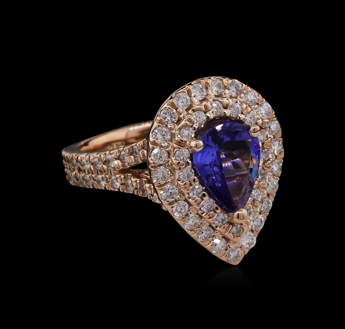 One electronically tested 14KT rose gold lady's cast fashion ring with a split shank with a bright polish finish. The featured lady's ring has a shank measuring 3.41 millimeters wide. Identified with markings of "14K". Condition is new, good workmanship. Containing: One prong set pear modified brilliant cut natural tanzanite, measuring 9.20 x 6.74 x 3.72mm, approximate weight of 1.46ct., clarity is eye clean, type I, medium, very slightly grayish, bluish violet color, (GIA bV 5/3), cut is very good. Transmitting light with no distortion, transparent. Colored gemstones are presumed to have been subjected to commonly used enhancement processes. Graded in the setting. Twenty-Three prong set round brilliant cut diamonds, measuring 1.80 - 1.70 x 1.05mm (depth est.) approximate total weight of 23 Stones = 0.44ct. Graded in the setting. Clarity: SI-1 to SI-2 . Color: H - I. Cut Good Sixty-Four prong set round brilliant cut diamonds, measuring 1.50 - 1.30 x 0.85mm (depth est.) approximate total weight of 64 Stones = 0.64ct. Graded in the setting. Clarity: SI-1 to I-1 . Color: H - I. Cut Good. Total Weight of Colored Stones 1.46ct. Total Weight of Diamonds 1.08ct. Total Weight of Ring 8.30 grams. GAS Appraised at $6,435.00.
