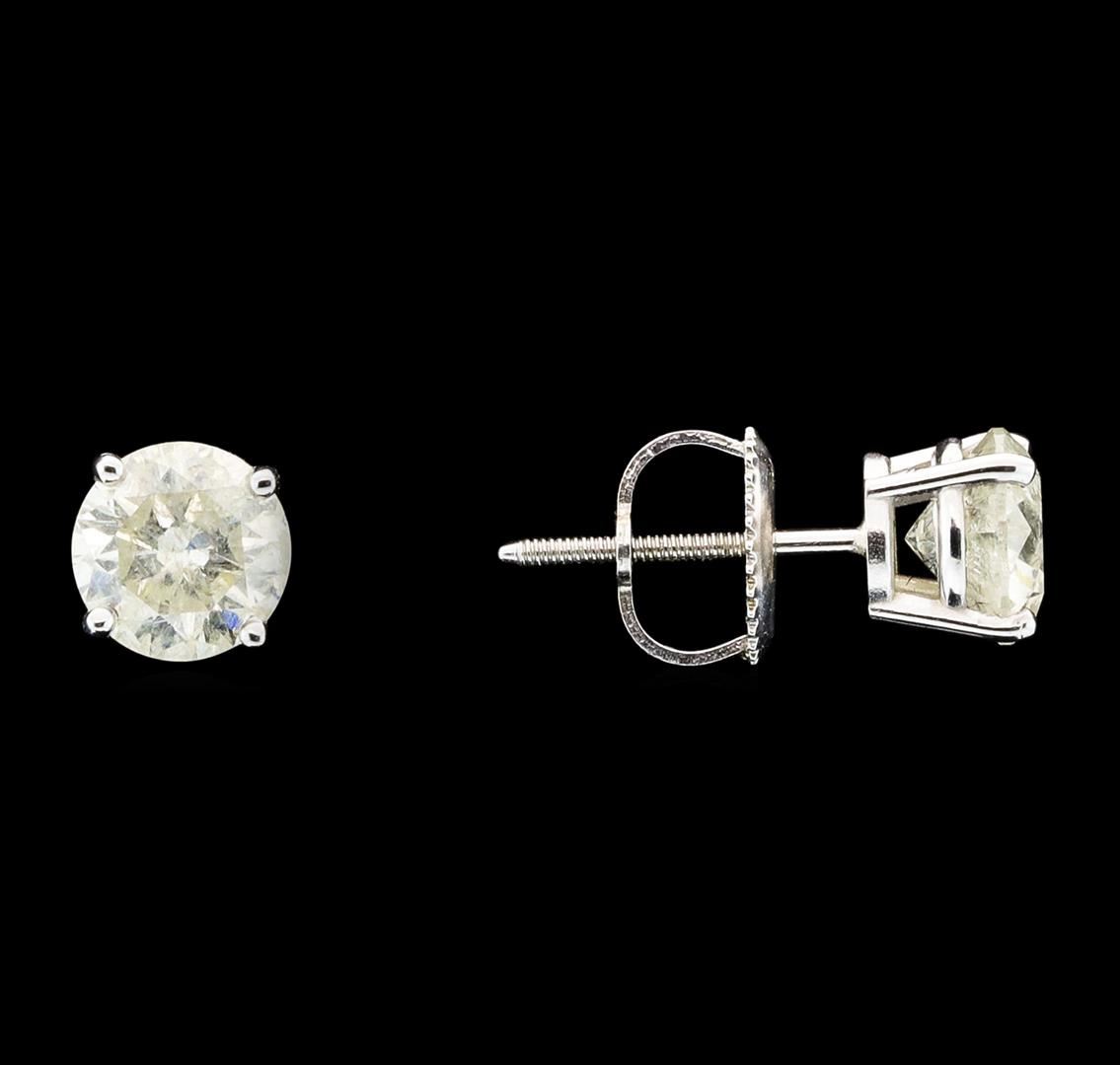 One 14KT white gold cast & assembled diamond solitaire earrings with screw backs. Condition is new, good workmanship. Containing: One prong set round brilliant cut diamond, measuring 5.65 - 5.60 x 3.40mm (depth est.) approximate weight of 0.71ct. Graded in the setting. Clarity: I-2. Color: KDepth 60.4%. Table 60.4%. One prong set round brilliant cut diamond, measuring 5.60 - 5.60 x 3.60mm (depth est.), 3.00.%. GTCF approximate weight of 0.75ct. Graded in the setting. Clarity: I-2. Color: KDepth 64.3%. Table 58.9%. Total Weight of Diamonds 1.46ct. Total Weight of Earrings 0.98gm. AIG Appraised.