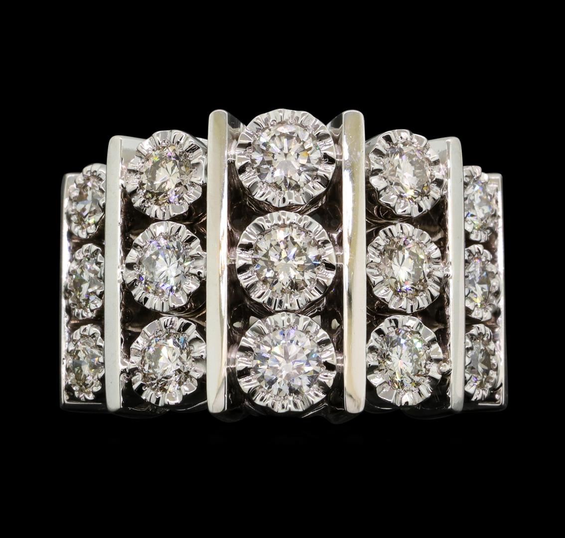 One electronically tested 14KT white gold lady's cast fashion ring with a channeled tapered wide band with a bright polish finish. The featured lady's ring has a shank measuring 2.00 millimeters wide. Identified with markings of "14K". Condition is new, good workmanship. Containing: Three prong set round brilliant cut diamonds, measuring 3.50 - 3.40 x 2.14mm (depth est.) approximate total weight of 3 Stones = 0.47ct. Graded in the setting. Color I - JClarity SI-1 to SI-2 Cut Good Six prong set round brilliant cut diamonds, measuring 3.00 - 2.90 x 1.83mm (depth est.) approximate total weight of 6 Stones = 0.60ct. Graded in the setting. Color I - JClarity SI-1 to I-1 Cut Good Six prong set round brilliant cut diamonds, measuring 2.70 - 2.60 x 1.64mm (depth est.) approximate total weight of 6 Stones = 0.43ct. Graded in the setting. Color I - JClarity SI-1 to SI-3 Cut Good. Total Weight of Diamonds 1.50ct. Total Weight of Ring 10.80gm. GAS Appraised.
