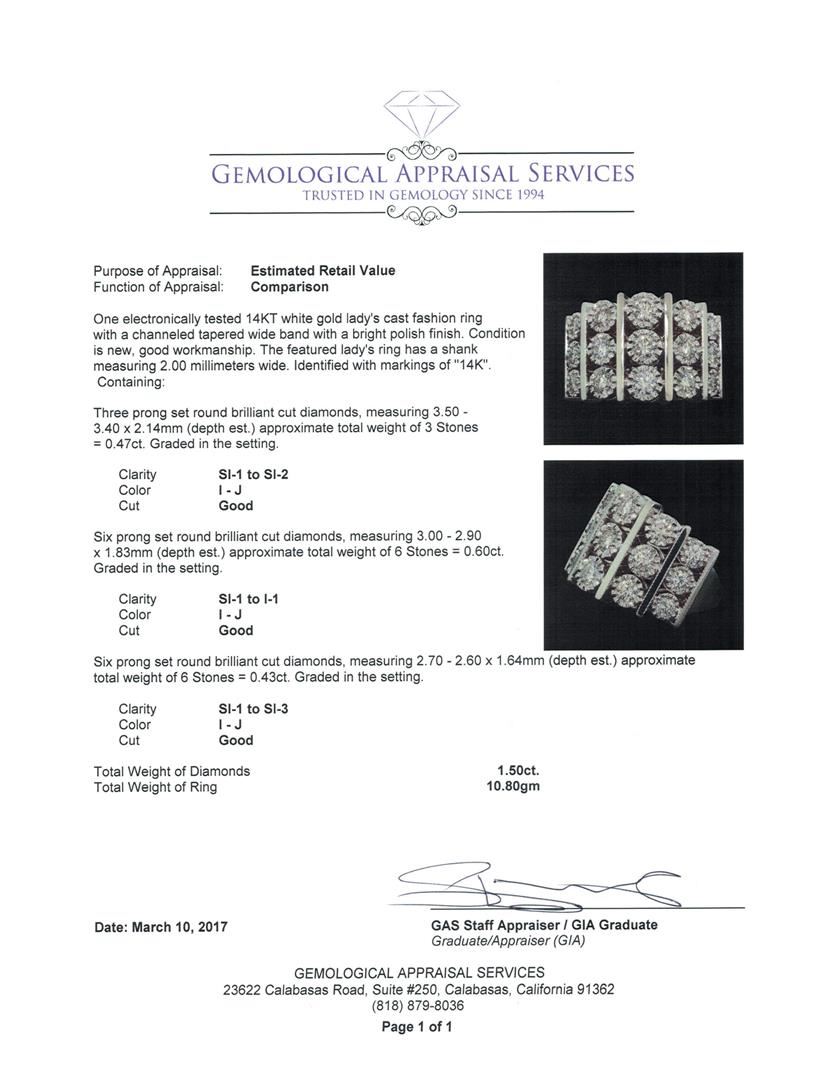 One electronically tested 14KT white gold lady's cast fashion ring with a channeled tapered wide band with a bright polish finish. The featured lady's ring has a shank measuring 2.00 millimeters wide. Identified with markings of "14K". Condition is new, good workmanship. Containing: Three prong set round brilliant cut diamonds, measuring 3.50 - 3.40 x 2.14mm (depth est.) approximate total weight of 3 Stones = 0.47ct. Graded in the setting. Color I - JClarity SI-1 to SI-2 Cut Good Six prong set round brilliant cut diamonds, measuring 3.00 - 2.90 x 1.83mm (depth est.) approximate total weight of 6 Stones = 0.60ct. Graded in the setting. Color I - JClarity SI-1 to I-1 Cut Good Six prong set round brilliant cut diamonds, measuring 2.70 - 2.60 x 1.64mm (depth est.) approximate total weight of 6 Stones = 0.43ct. Graded in the setting. Color I - JClarity SI-1 to SI-3 Cut Good. Total Weight of Diamonds 1.50ct. Total Weight of Ring 10.80gm. GAS Appraised.