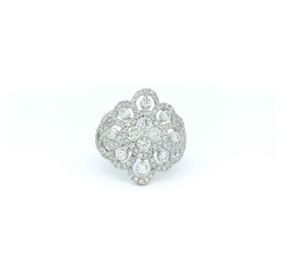 One electronically tested 14KT white gold lady's cast fashion designer ring with a floral cluster dome motif with a bright polish finish. Condition is new, good workmanship. The featured lady's ring has a shank measuring 2.80 millimeters in width. Identif GAS Appraised.