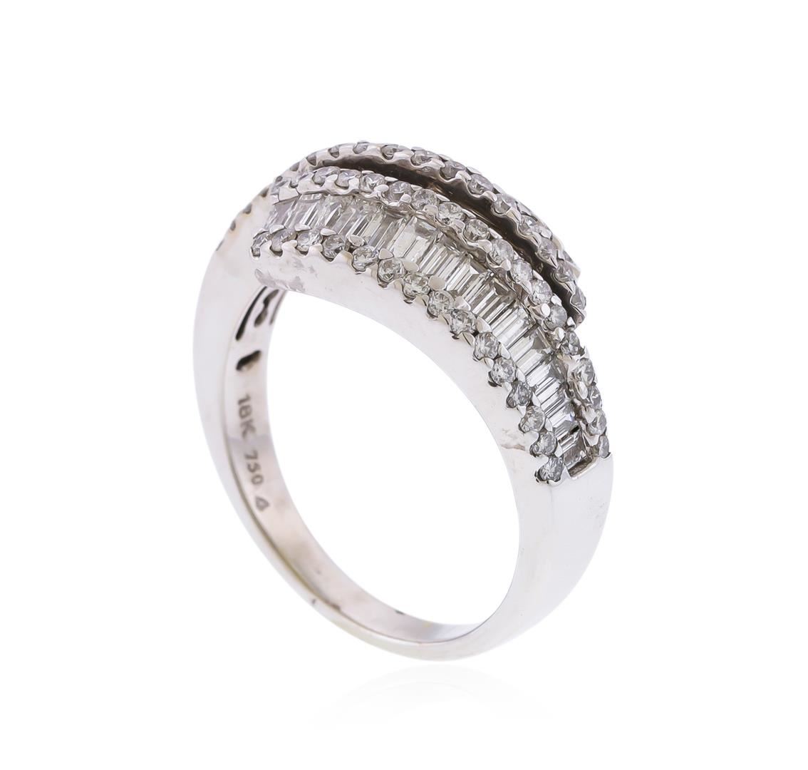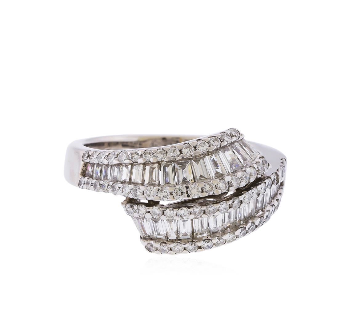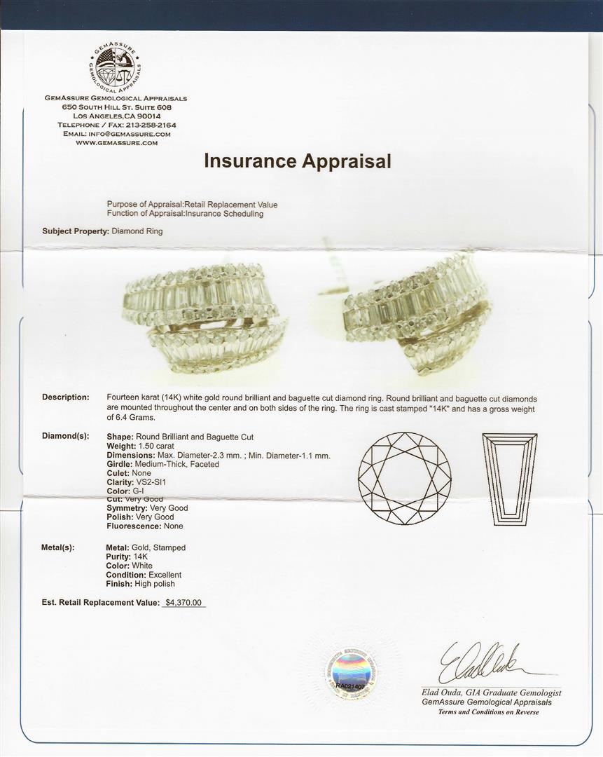 Fourteen karat (14K) white gold round brilliant and baguette cut diamond ring. Round brilliant and baguette cut diamonds are mounted throughout weighing approximately 1.50ctw. The ring is Cast stamped "14K" and has a gross weight of 6.4 Grams. GGA Appraised at $4,370.00.