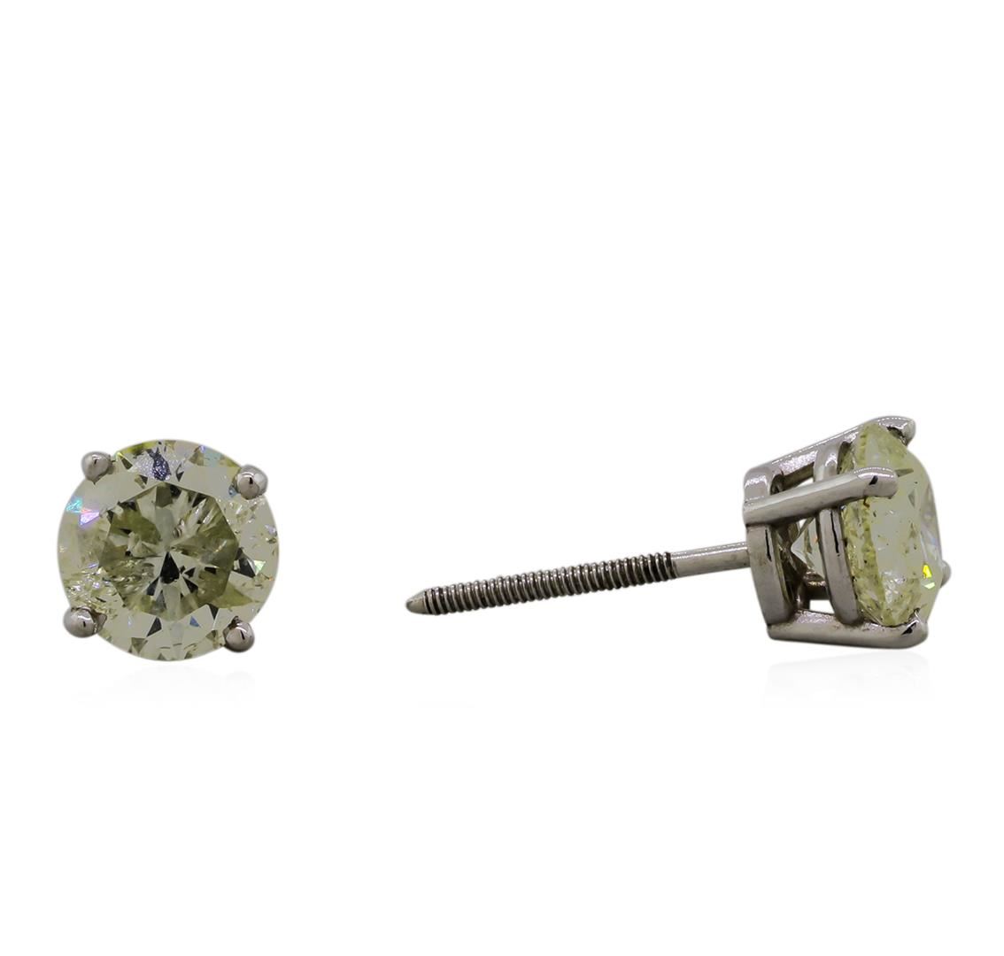 One pair electronically tested 14KT white gold cast & assembled diamond solitaire earrings with screw backs. Condition is new, good workmanship. Containing: One prong set round brilliant cut diamond, measuring 5.60 - 5.60 x 3.60mm (depth est.), 3.00.%. GTCF approximate weight of 0.72ct with a medium blue fluorescence. Graded in the setting. Clarity: I-2. Color: LDepth 64.3%. Table 57.1%. One prong set round brilliant cut diamond, measuring 5.70 - 5.60 x 3.70mm (depth est.), 5.00.%. GTCF approximate weight of 0.78ct with a very strong blue fluorescence. Graded in the setting. Clarity: I-2. Color: LDepth 65.5%. Table 63.7%. Total Weight of Diamonds 1.50ct. Total Weight of Earrings 0.97gm. AIG Appraised at $4,095.00.