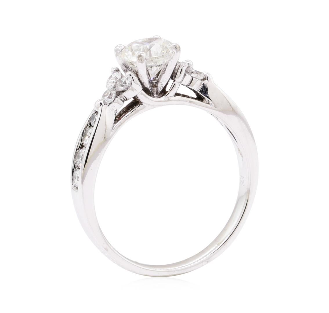 One electronically tested 14KT white gold lady's combination cast & assembled fashion wedding ring with a scalloped cathedral shank with a bright polish finish. The featured lady's ring has a shank measuring 2.20 millimeters in width. Identified with markings of '14K 585'. Condition is new, good workmanship. Containing: One prong set round brilliant cut diamond, measuring 6.28 - 6.24 x 4.20mm (depth est.) approximate weight of 1.00ct. Graded in the setting. Color I, Clarity I-1, Cut Very Good Twelve channel and prong set round brilliant cut diamonds, measuring 2.30 - 2.10 x 1.36mm (depth est.) approximate total weight of 12 Stones = 0.48ct. Graded in the setting. Color G - H, Clarity SI-1 to SI-2, Cut Very Good Two channel set round brilliant cut diamonds, measuring 1.50 - 1.45 x 0.92mm (depth est.) approximate total weight of 2 Stones = 0.03ct. Graded in the setting. Color H, Clarity SI-1 to SI-2, Cut Very Good. Total Weight of Diamonds 1.51ct. Total Weight of Wedding Ring 3.40gm. GAS Appraised.