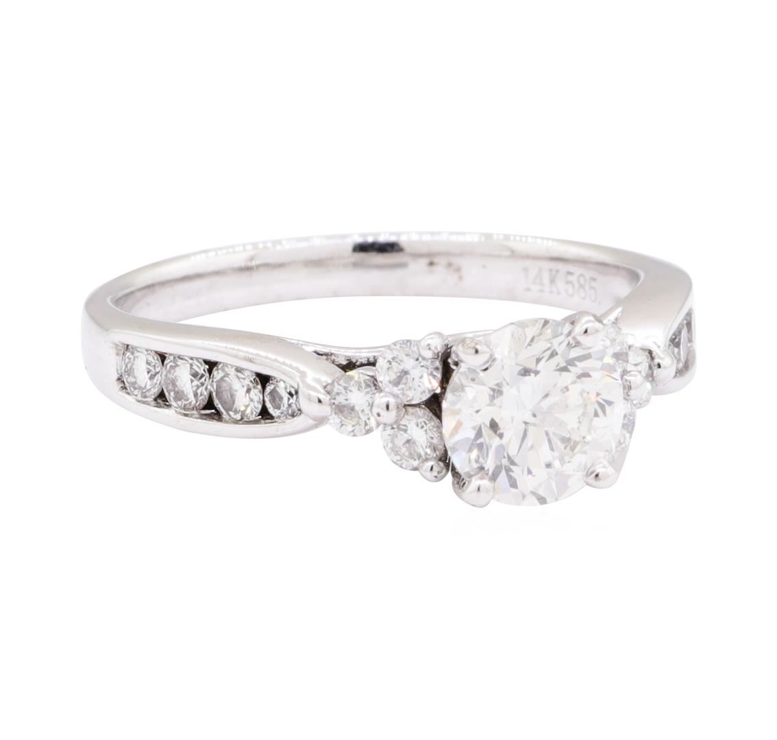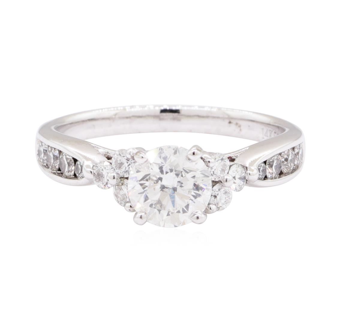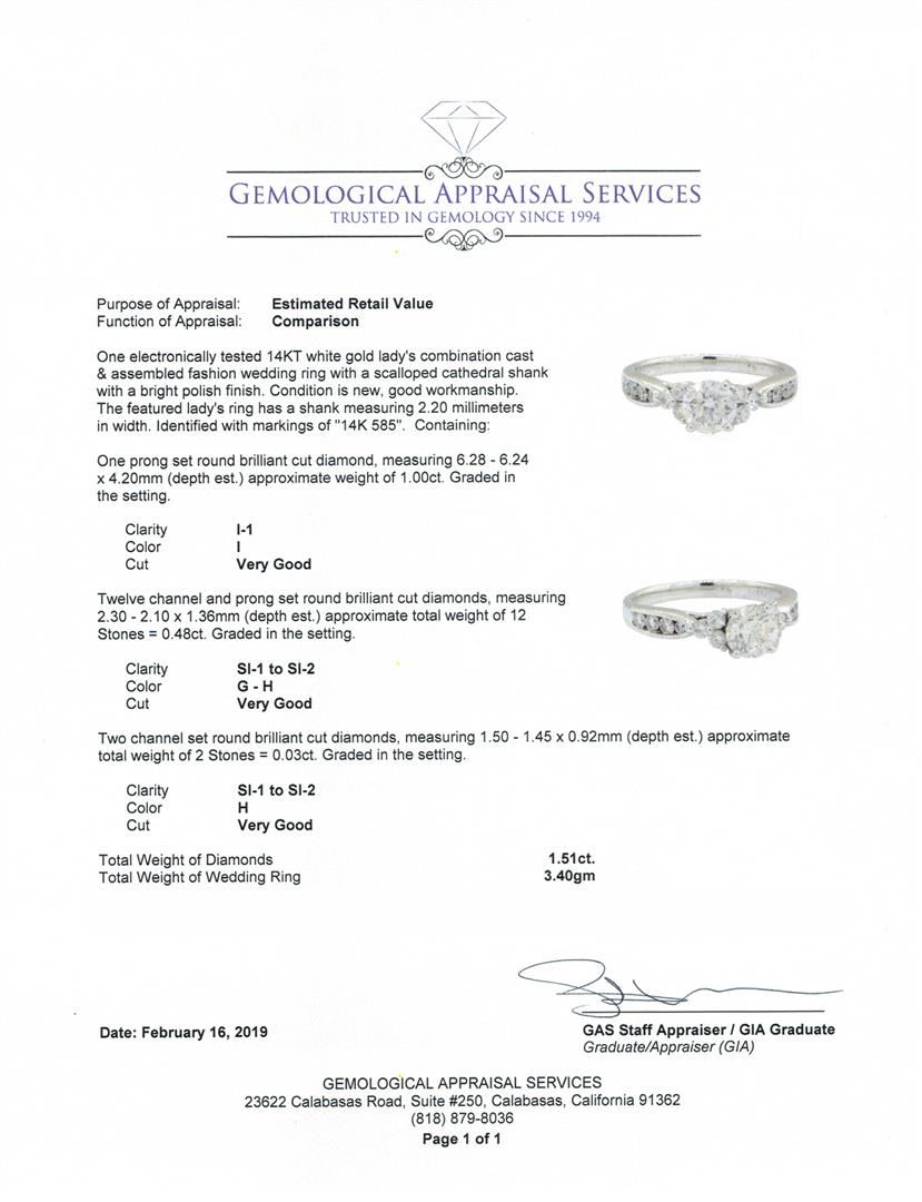 One electronically tested 14KT white gold lady's combination cast & assembled fashion wedding ring with a scalloped cathedral shank with a bright polish finish. The featured lady's ring has a shank measuring 2.20 millimeters in width. Identified with markings of '14K 585'. Condition is new, good workmanship. Containing: One prong set round brilliant cut diamond, measuring 6.28 - 6.24 x 4.20mm (depth est.) approximate weight of 1.00ct. Graded in the setting. Color I, Clarity I-1, Cut Very Good Twelve channel and prong set round brilliant cut diamonds, measuring 2.30 - 2.10 x 1.36mm (depth est.) approximate total weight of 12 Stones = 0.48ct. Graded in the setting. Color G - H, Clarity SI-1 to SI-2, Cut Very Good Two channel set round brilliant cut diamonds, measuring 1.50 - 1.45 x 0.92mm (depth est.) approximate total weight of 2 Stones = 0.03ct. Graded in the setting. Color H, Clarity SI-1 to SI-2, Cut Very Good. Total Weight of Diamonds 1.51ct. Total Weight of Wedding Ring 3.40gm. GAS Appraised.