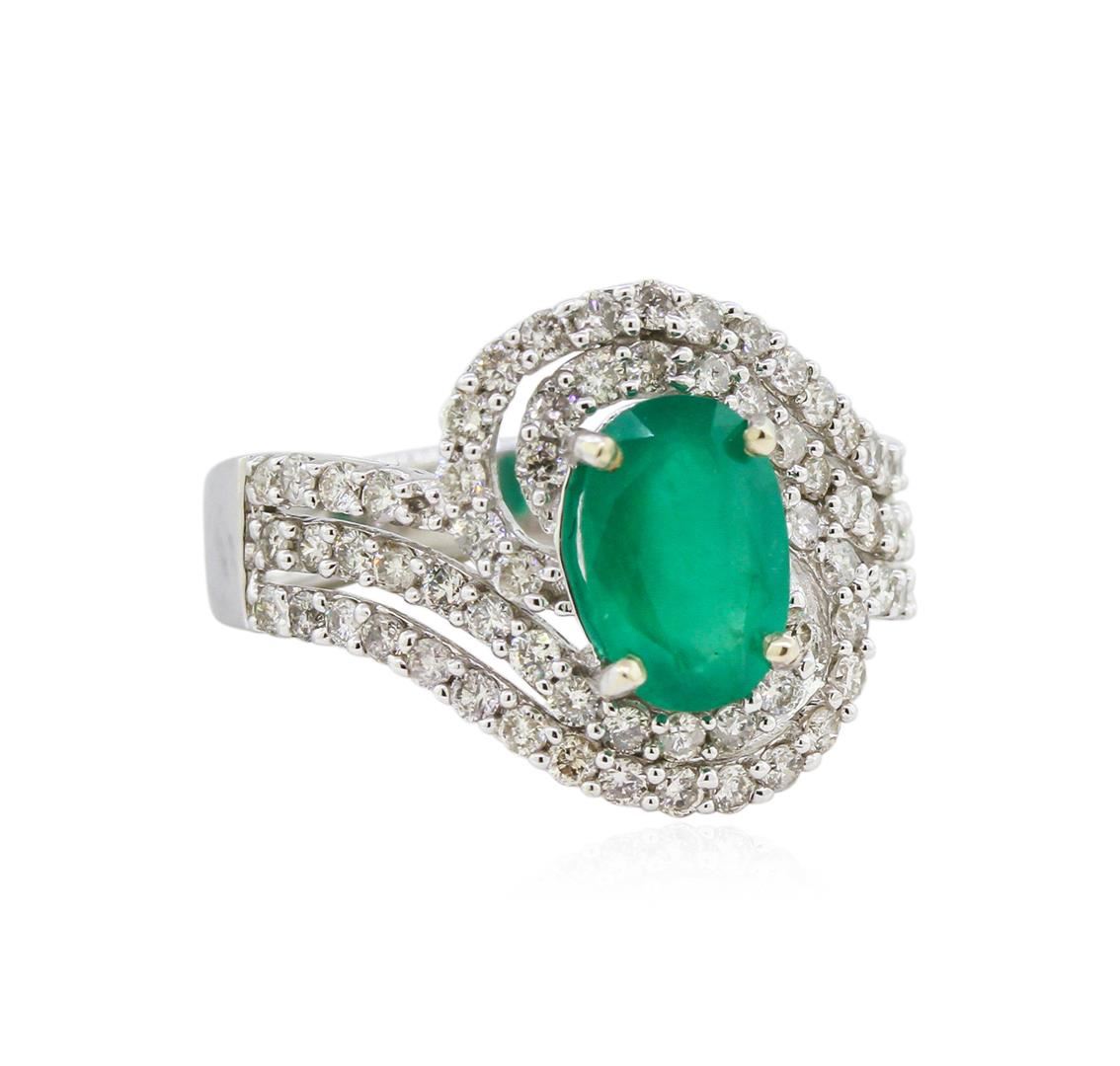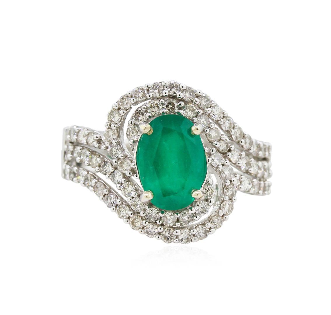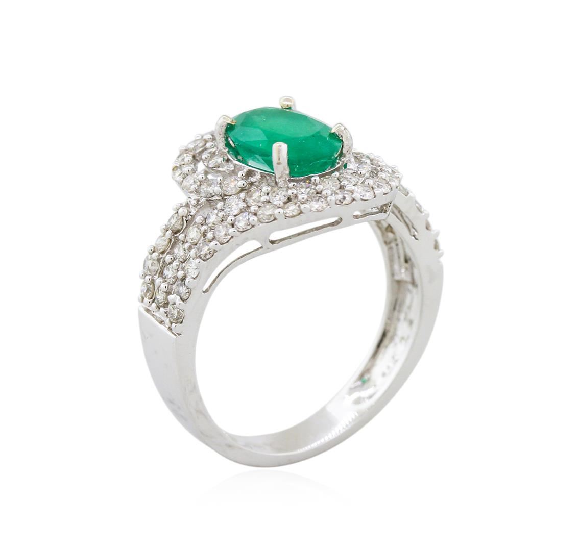 One electronically tested 14KT white gold ladies cast emerald and diamond ring with a bright polish finish. The featured emerald is set within a two tiered diamond lattice gallery, supported by diamond set three way split shoulders and completed by a three millimeter wide band. Trademark is Orianne. Identified with markings of "14K". Condition is new, good workmanship. Containing: One prong set oval mixed cut natural emerald, measuring 9.00 x 6.10 x 4.30mm, approximate weight of 1.52ct., clarity is heavily included, type III, medium dark, very slightly grayish, very slightly bluish green color, (GIA vslbG 6/3), cut is good. Transmitting light with a minimum of distortion, transparent to translucent. Naturally occurring internal & external characteristics are present. Indications of oil residue. Graded in the setting.Sixty-Eight prong set round brilliant cut diamonds, measuring 1.60 - 1.50 x 0.93mm (depth est.) approximate. Total Weight of 68 Stones = 0.98ct. Graded in the setting. Clarity: I-1 to I-2. Color: G - I. Total Weight of Colored Stones 1.52ct. Total Weight of Diamonds 0.98ct. AIG Appraised at $5,700.00.