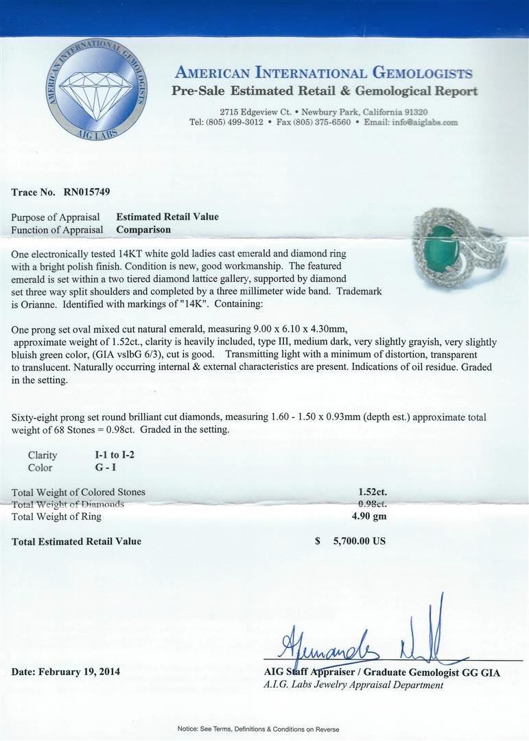 One electronically tested 14KT white gold ladies cast emerald and diamond ring with a bright polish finish. The featured emerald is set within a two tiered diamond lattice gallery, supported by diamond set three way split shoulders and completed by a three millimeter wide band. Trademark is Orianne. Identified with markings of "14K". Condition is new, good workmanship. Containing: One prong set oval mixed cut natural emerald, measuring 9.00 x 6.10 x 4.30mm, approximate weight of 1.52ct., clarity is heavily included, type III, medium dark, very slightly grayish, very slightly bluish green color, (GIA vslbG 6/3), cut is good. Transmitting light with a minimum of distortion, transparent to translucent. Naturally occurring internal & external characteristics are present. Indications of oil residue. Graded in the setting.Sixty-Eight prong set round brilliant cut diamonds, measuring 1.60 - 1.50 x 0.93mm (depth est.) approximate. Total Weight of 68 Stones = 0.98ct. Graded in the setting. Clarity: I-1 to I-2. Color: G - I. Total Weight of Colored Stones 1.52ct. Total Weight of Diamonds 0.98ct. AIG Appraised at $5,700.00.