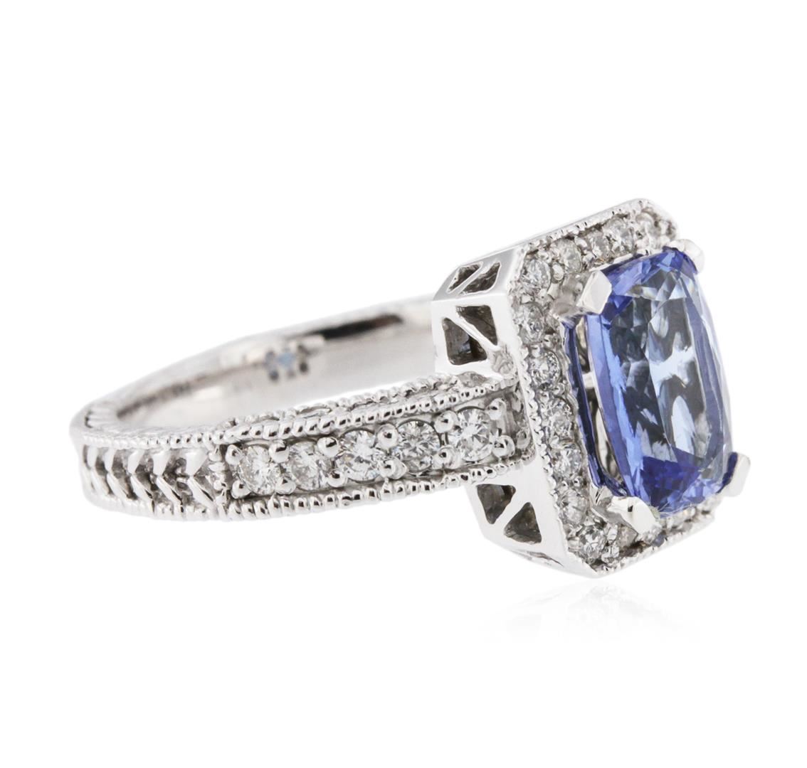 One electronically tested 14KT white gold ladies combination cast & assembled tanzanite and diamond ring with a bright polish finish. Identified with markings of "14K". Condition is new. Containing: One prong set rectangular cushion modified brilliant cut natural tanzanite, measuring 8.80 x 6.80 x 3.26mm, approximate weight of 1.54ct., clarity is eye clean, type I, medium light, slightly grayish, violet color, (GIA V 4/2), cut is good. Thirty prong set round brilliant cut diamonds, measuring 1.60 - 1.30 x 0.87mm (depth est.) approximate total weight of 30 Stones = 0.33ct. Clarity: SI-1 to SI-2. Color: I - J, Cut is Good. Colored gemstones are presumed to have been subjected to commonly used enhancement processes. All diamonds and colored gemstones are graded in the mounting, unless otherwise stated. Total Weight of Colored Stones 1.54ct. Total Weight of Diamonds 0.33ct. Total Weight of Ring 6.50 grams. GGL Appraised at $4,245.00.
