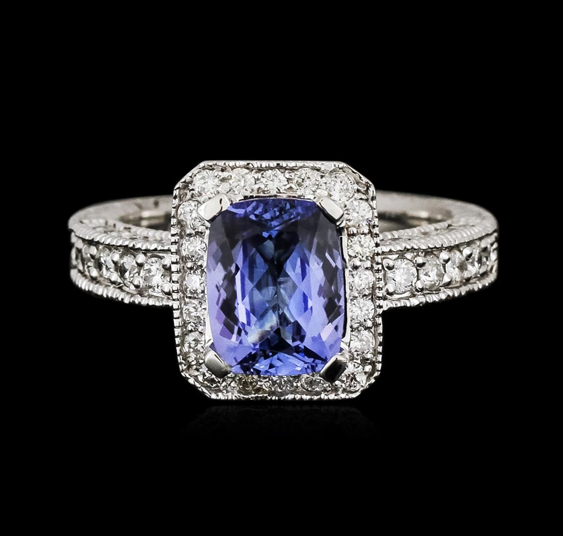 One electronically tested 14KT white gold ladies combination cast & assembled tanzanite and diamond ring with a bright polish finish. Identified with markings of "14K". Condition is new. Containing: One prong set rectangular cushion modified brilliant cut natural tanzanite, measuring 8.80 x 6.80 x 3.26mm, approximate weight of 1.54ct., clarity is eye clean, type I, medium light, slightly grayish, violet color, (GIA V 4/2), cut is good. Thirty prong set round brilliant cut diamonds, measuring 1.60 - 1.30 x 0.87mm (depth est.) approximate total weight of 30 Stones = 0.33ct. Clarity: SI-1 to SI-2. Color: I - J, Cut is Good. Colored gemstones are presumed to have been subjected to commonly used enhancement processes. All diamonds and colored gemstones are graded in the mounting, unless otherwise stated. Total Weight of Colored Stones 1.54ct. Total Weight of Diamonds 0.33ct. Total Weight of Ring 6.50 grams. GGL Appraised.