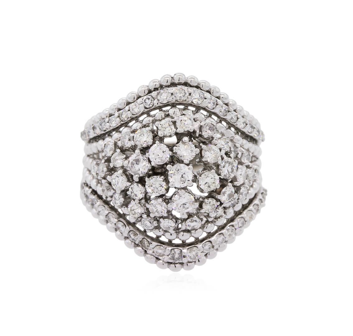One electronically tested 14KT white gold lady's cast fashion ring with a bright polish finish. The featured lady's ring has tapered wide band cluster motif with a shank measuring 3.60 millimeters in width. Identified with markings of "14K". Condition is new, good workmanship. Containing: Three prong set round brilliant cut diamonds, measuring 3.40 - 3.35 x 2.03mm (depth est.) approximate total weight of 3 Stones = 0.42ct. Graded in the setting. Clarity: I-1. Color: H - I. Cut Good Twelve prong set round brilliant cut diamonds, measuring 2.20 - 2.10 x 1.29mm (depth est.) approximate total weight of 12 Stones = 0.43ct. Graded in the setting. Clarity: SI-2 to I-1. Color: H - I. Cut Good Sixty-Three prong set round brilliant cut diamonds, measuring 1.70 - 1.20 x 0.87mm (depth est.) approximate total weight of 63 Stones = 0.69ct. Graded in the setting. Clarity: SI-1 to I-1. Color: H - I. Cut Good. Total Weight of Diamonds 1.54ct. Total Weight of Ring 7.40 grams. GAS Appraised at $5,025.00.