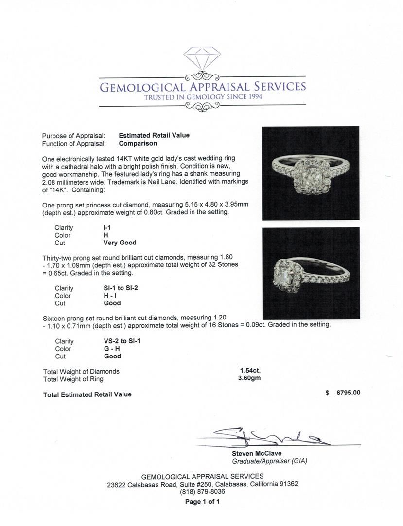 One electronically tested 14KT white gold lady's cast wedding ring with a cathedral halo with a bright polish finish. The featured lady's ring has a shank measuring 2.08 millimeters wide. Trademark is Neil Lane. Identified with markings of "14K". Condition is new, good workmanship. Containing: One prong set princess cut diamond, measuring 5.15 x 4.80 x 3.95mm (depth est.) approximate weight of 0.80ct. Graded in the setting. Clarity: I-1. Color: HCut Very Good Thirty-Two prong set round brilliant cut diamonds, measuring 1.80 - 1.70 x 1.09mm (depth est.) approximate total weight of 32 Stones = 0.65ct. Graded in the setting. Clarity: SI-1 to SI-2. Color: H - ICut Good Sixteen prong set round brilliant cut diamonds, measuring 1.20 - 1.10 x 0.71mm (depth est.) approximate total weight of 16 Stones = 0.09ct. Graded in the setting. Clarity: VS-2 to SI-1. Color: G - HCut Good. Total Weight of Diamonds 1.54ct. Total Weight of Ring 3.60gm. GAS Appraised at $6,795.00.