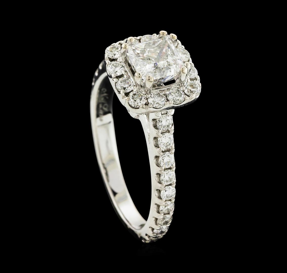One electronically tested 14KT white gold lady's cast wedding ring with a cathedral halo with a bright polish finish. The featured lady's ring has a shank measuring 2.08 millimeters wide. Trademark is Neil Lane. Identified with markings of "14K". Condition is new, good workmanship. Containing: One prong set princess cut diamond, measuring 5.15 x 4.80 x 3.95mm (depth est.) approximate weight of 0.80ct. Graded in the setting. Clarity: I-1. Color: HCut Very Good Thirty-Two prong set round brilliant cut diamonds, measuring 1.80 - 1.70 x 1.09mm (depth est.) approximate total weight of 32 Stones = 0.65ct. Graded in the setting. Clarity: SI-1 to SI-2. Color: H - ICut Good Sixteen prong set round brilliant cut diamonds, measuring 1.20 - 1.10 x 0.71mm (depth est.) approximate total weight of 16 Stones = 0.09ct. Graded in the setting. Clarity: VS-2 to SI-1. Color: G - HCut Good. Total Weight of Diamonds 1.54ct. Total Weight of Ring 3.60gm. GAS Appraised.