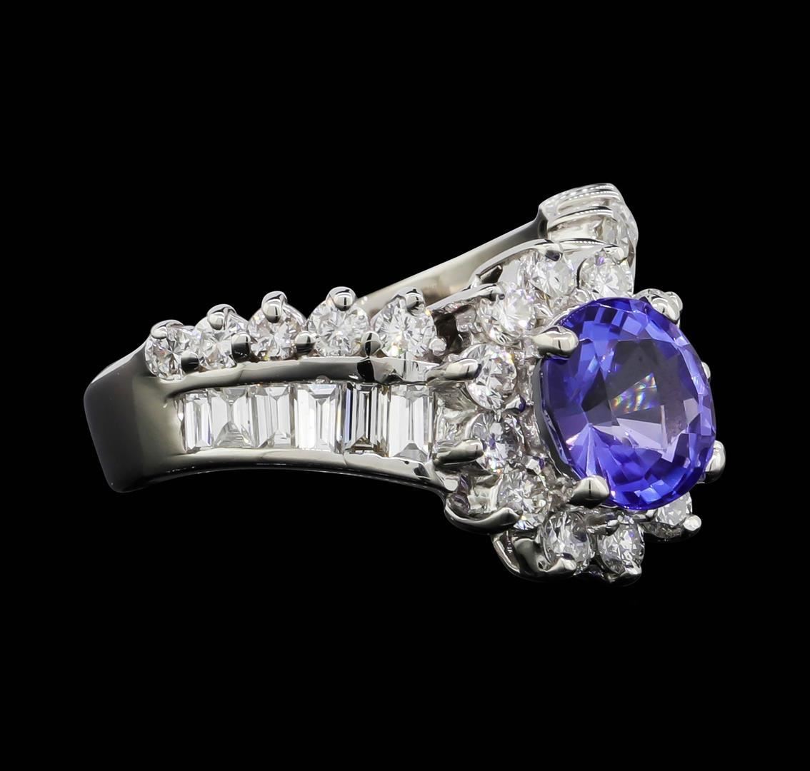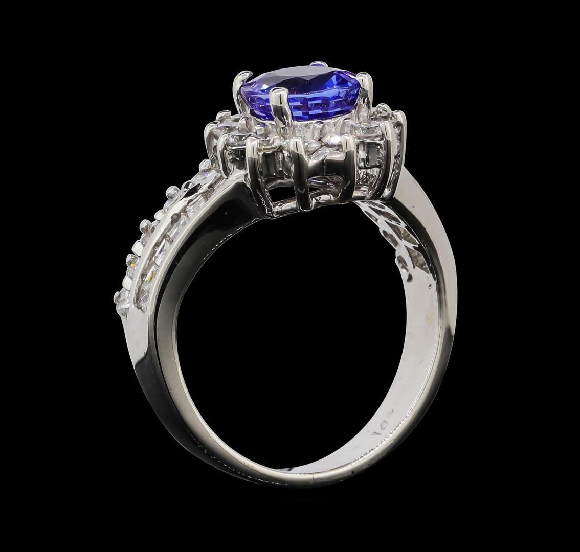 One electronically tested 14KT white gold lady's cast fashion ring with a chevron motif shank with a halo with a bright polish finish. The featured lady's ring has a shank measuring 3.26 millimeters wide. Identified with markings of "14K". Condition is like new, good workmanship. Containing: One prong set oval modified mixed cut natural tanzanite, measuring 7.20 x 6.67 x 4.32mm, (depth est.) 5%. bulge factor, approximate weight of 1.55ct., clarity is eye clean, medium light, moderately strong, violet color, (GIA V 4/4), cut is good. Transmitting light with no distortion, transparent. Colored gemstones are presumed to have been subjected to commonly used enhancement processes. Graded in the setting. Twenty-Two prong set round brilliant cut diamonds, measuring 2.00 - 1.90 x 1.21mm (depth est.) approximate total weight of 22 Stones = 0.62ct. Graded in the setting. Clarity: VS-2 to SI-1. Color: H - ICut Good Twelve channel set baguette cut diamonds, measuring from 2.00 x 1.20 x 1.02mm (depth est.) to 2.50 x 1.50 x 1.28mm (depth est.) approximate total weight of 12 Stones = 0.38ct. Graded in the setting. Clarity: VS-1 to VS-2. Color: H - ICut Very Good. Total Weight of Colored Stones 1.55ct. Total Weight of Diamonds 1.00ct. Total Weight of Ring 5.30gm. GAS Appraised.