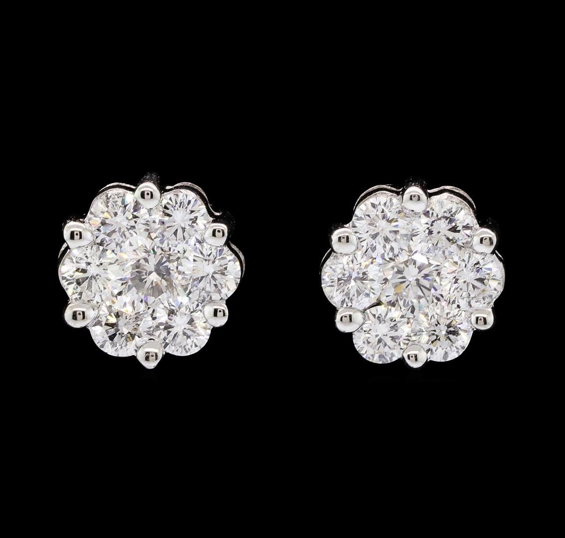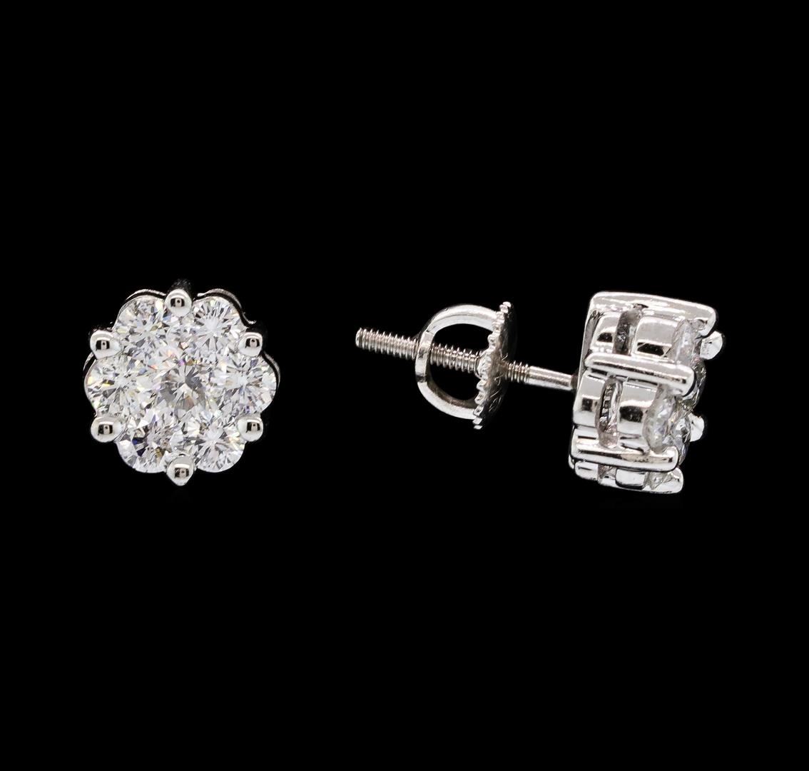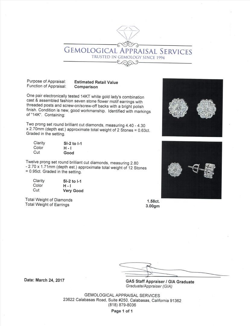 One pair electronically tested 14KT white gold lady's combination cast & assembled fashion seven stone flower motif earrings with threaded posts and screw-on/screw-off backs with a bright polish finish. Identified with markings of "14K". Condition is new, good workmanship. Containing: Two prong set round brilliant cut diamonds, measuring 4.40 - 4.30 x 2.70mm (depth est.) approximate. Total Weight of 2 Stones = 0.63ct. Graded in the setting. Color H - I Clarity SI-2 to I-1 Cut Good Twelve prong set round brilliant cut diamonds, measuring 2.80 - 2.70 x 1.71mm (depth est.) approximate. Total Weight of 12 Stones = 0.95ct. Graded in the setting. Color H - I Clarity SI-2 to I-1 Cut Very Good. Total Weight of Diamonds 1.58ct.. Total Weight of Earrings 3.00gm. GAS Appraised.