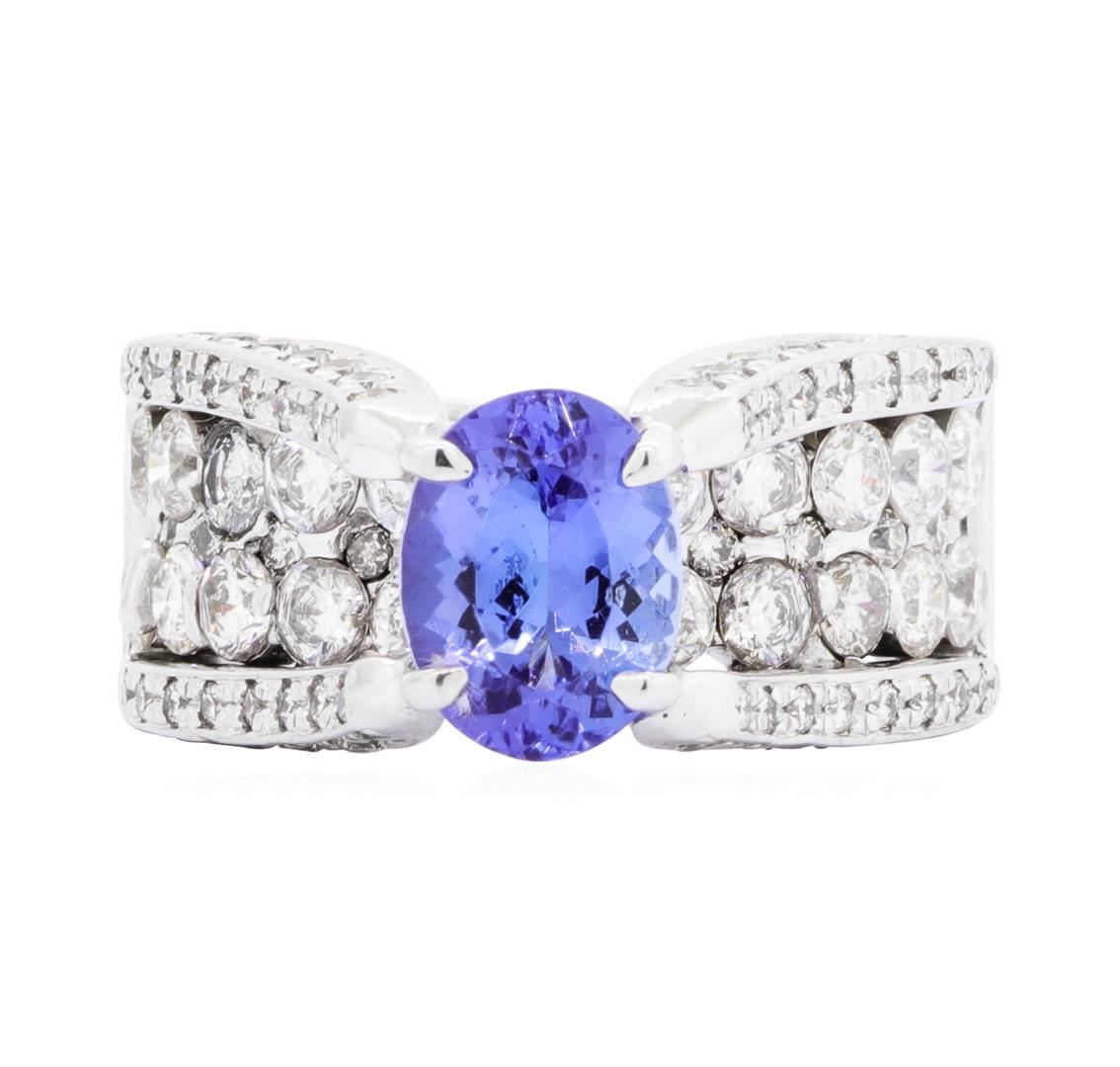 One electronically tested 14KT white gold Ladies cast fashion ring with a cathedral European shank with a bright polish finish. The featured Ladies ring has a shank measuring 4.90 millimeters wide. Condition is like new, good workmanship. Containing: One prong set oval modified brilliant cut natural tanzanite, measuring 8.95 x 6.75 x 4.20mm, (depth est.) approximate weight of 1.59ct., clarity is slightly included, medium, moderately strong, violetish blue color, (GIA vB 5/4), cut is good. Transmitting light with a minimum of distortion, transparent. Colored gemstones are presumed to have been subjected to commonly used enhancement processes. Graded in the setting. Twenty-Two prong set round brilliant cut diamonds, measuring 2.70 - 2.60 x 1.64mm (depth est.) approximate total weight of 22 Stones = 1.55ct. Graded in the setting. Color H - J Clarity SI-1 to SI-3 Cut Good Forty-Two prong set round brilliant cut diamonds, measuring 1.60 - 1.40 x 0.93mm (depth est.) approximate total weight of 42 Stones = 0.54ct. Graded in the setting. Color H - I Clarity SI-1 to I-1 Cut Good Forty prong set round brilliant cut diamonds, measuring 1.20 - 1.00 x 0.68mm (depth est.) approximate total weight of 40 Stones = 0.20ct. Graded in the setting. Color H - I Clarity SI-1 to SI-2 Cut Good. Total Weight of Colored Stones 1.59ct. Total Weight of Diamonds 2.29ct. Total Weight of Ring 11.70gm. GAS Appraised.