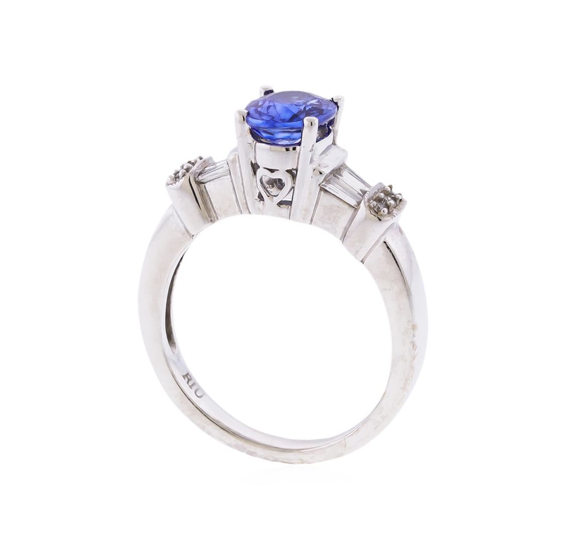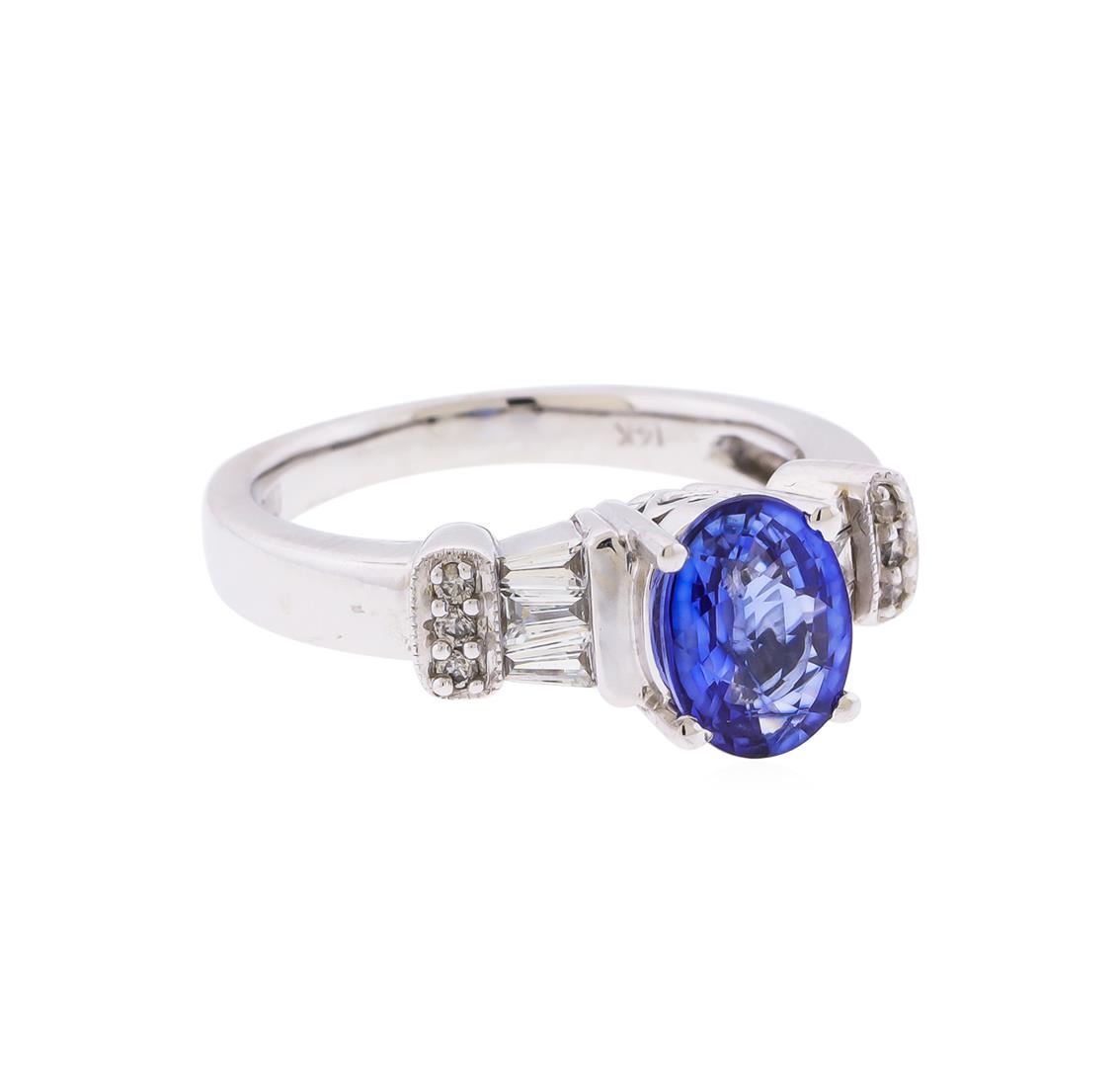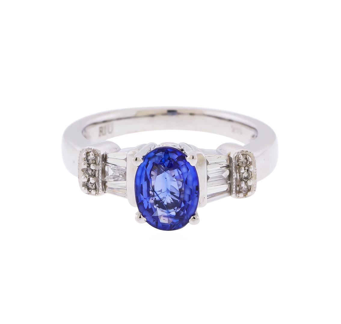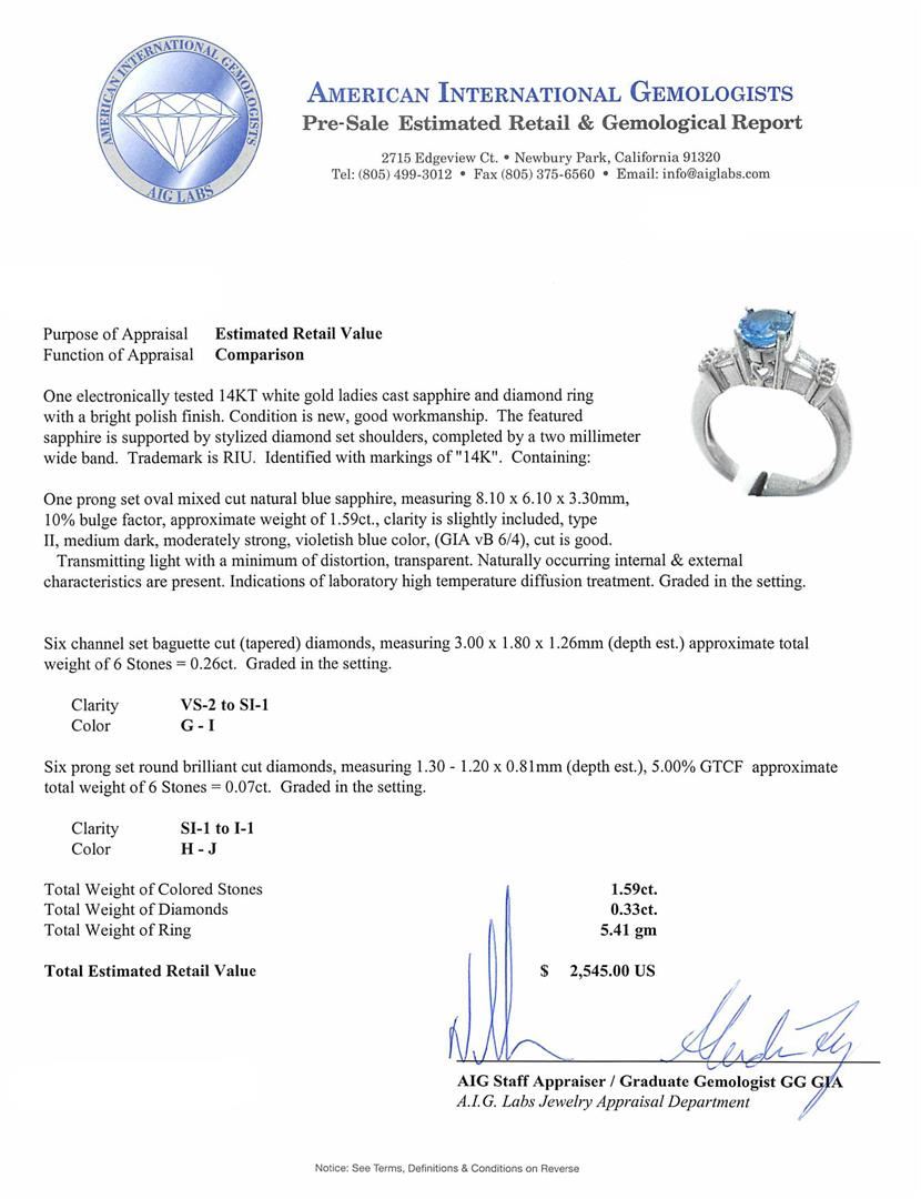 One electronically tested 14KT white gold ladies cast sapphire and diamond ring with a bright polish finish. The featured sapphire is supported by stylized diamond set shoulders, completed by a two millimeter wide band. Trademark is RIU. Identified with markings of "14K". Condition is new, good workmanship. Containing: One prong set oval mixed cut natural blue sapphire, measuring 8.10 x 6.10 x 3.30mm, 10%. bulge factor, approximate weight of 1.59ct., clarity is slightly included, type II, medium dark, moderately strong, violetish blue color, (GIA vB 6/4), cut is good. Transmitting light with a minimum of distortion, transparent. Naturally occurring internal & external characteristics are present. Indications of laboratory high temperature diffusion treatment. Graded in the setting.Six channel set baguette cut (tapered) diamonds, measuring 3.00 x 1.80 x 1.26mm (depth est.) approximate total weight of 6 Stones = 0.26ct. Graded in the setting. Clarity: VS-2 to SI-1. Color: G - I Six prong set round brilliant cut diamonds, measuring 1.30 - 1.20 x 0.81mm (depth est.), 5.00.%. GTCF approximate total weight of 6 Stones = 0.07ct. Graded in the setting. Clarity: SI-1 to I-1. Color: H - J. Total Weight of Colored Stones 1.59ct. Total Weight of Diamonds 0.33ct. Total Weight of Ring 5.41gm. AIG Appraised at $2,545.00.