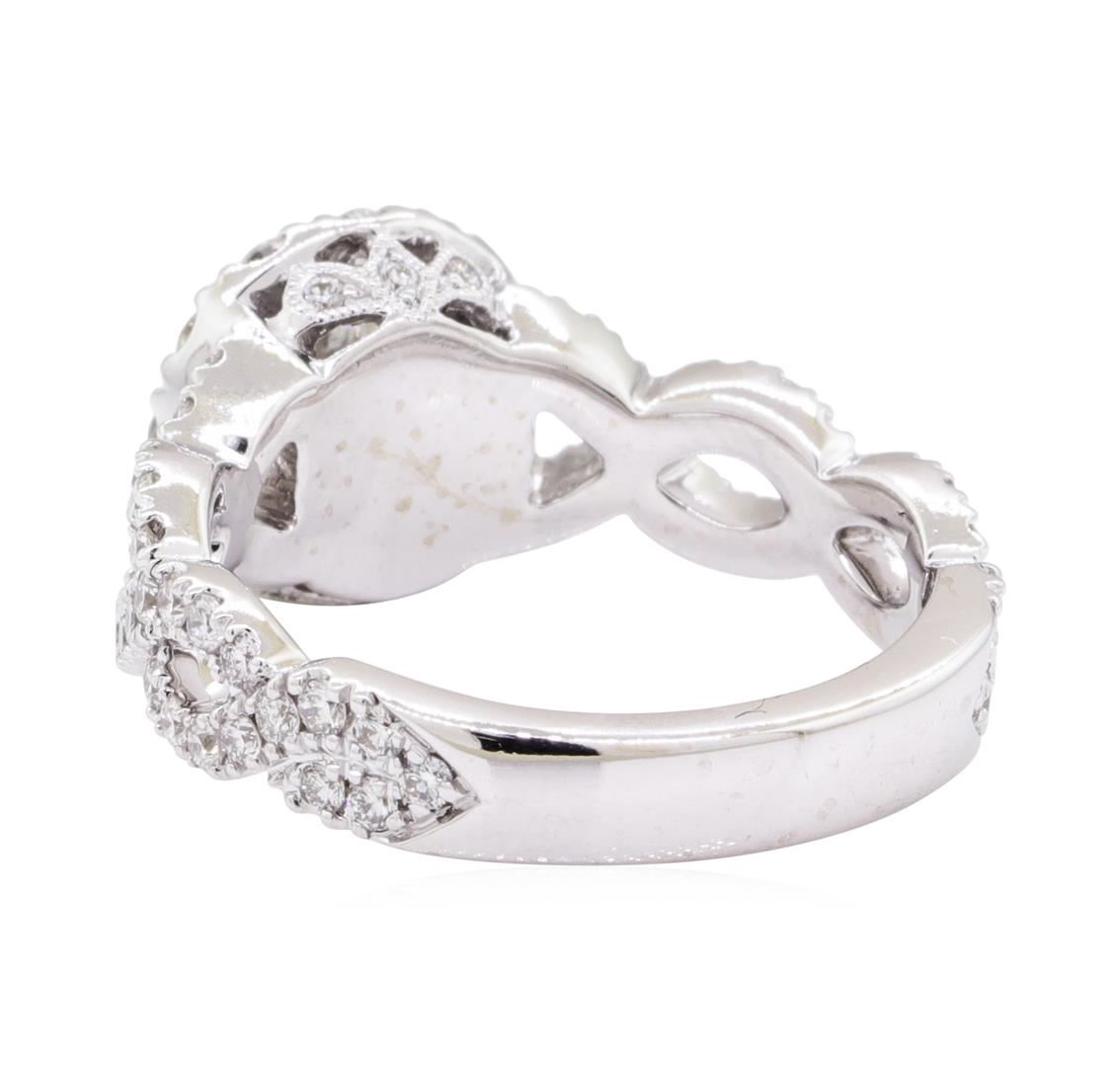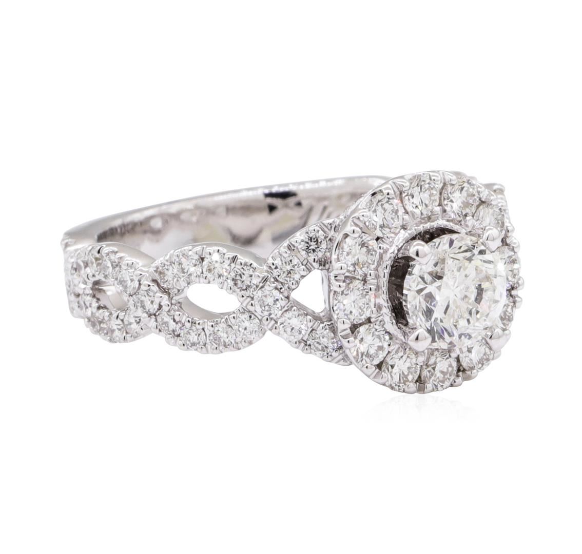 One electronically tested 14KT white gold lady's combination cast & assembled designer wedding ring with a crossover shank basket halo with a bright polish with milgrain detailing finish. The featured lady's ring has shank measuring 3.50 millimeters in width. Trademark is Neil Lane. Identified with markings of '14K'. Condition is new, good workmanship. Containing: One prong set round brilliant cut diamond, measuring 5.36 - 5.31 x 3.34mm (depth est.) approximate weight of 0.58ct. Graded in the setting. Color H, Clarity SI-2, Cut Very Good Twelve prong set round brilliant cut diamonds, measuring 2.10 - 2.00 x 1.27mm (depth est.) approximate total weight of 12 Stones = 0.40ct. Graded in the setting. Color G - H, Clarity VS-1 to SI-1, Cut Very Good Fifty-Six prong set round brilliant cut diamonds, measuring 1.45 - 1.40 x 0.87mm (depth est.) approximate total weight of 56 Stones = 0.60ct. Graded in the setting. Color G - H, Clarity VS-1 to SI-1, Cut Very Good Six prong set round brilliant cut diamonds, measuring 1.00 - 1.00 x 0.62mm (depth est.) approximate total weight of 6 Stones = 0.03ct. Graded in the setting. Color G - H, Clarity VS-2 to SI-1, Cut Very Good. Total Weight of Diamonds 1.61ct. Total Weight of Wedding Ring 6.80gm. GAS Appraised.