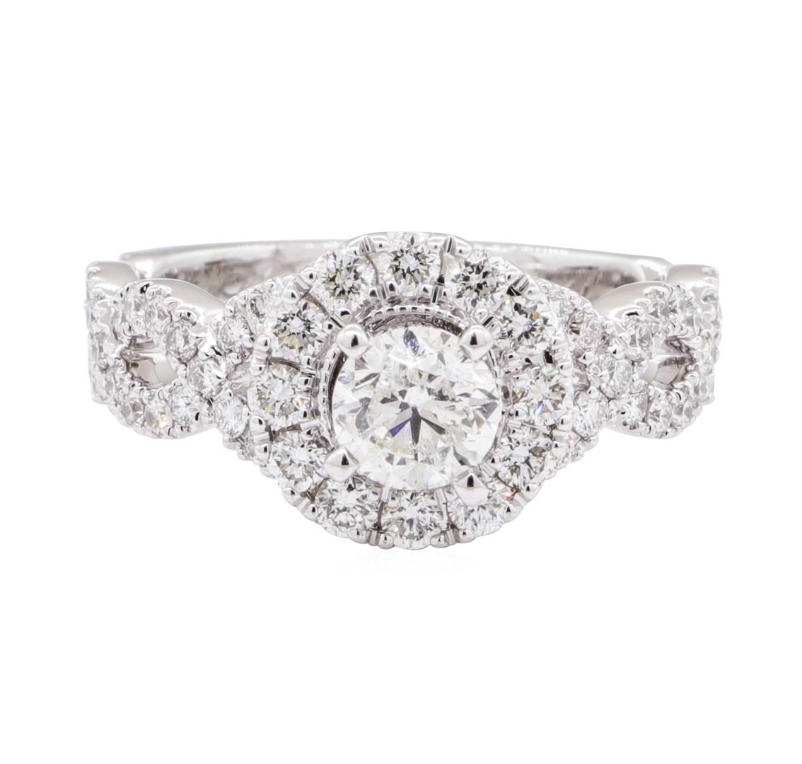 One electronically tested 14KT white gold lady's combination cast & assembled designer wedding ring with a crossover shank basket halo with a bright polish with milgrain detailing finish. The featured lady's ring has shank measuring 3.50 millimeters in width. Trademark is Neil Lane. Identified with markings of '14K'. Condition is new, good workmanship. Containing: One prong set round brilliant cut diamond, measuring 5.36 - 5.31 x 3.34mm (depth est.) approximate weight of 0.58ct. Graded in the setting. Color H, Clarity SI-2, Cut Very Good Twelve prong set round brilliant cut diamonds, measuring 2.10 - 2.00 x 1.27mm (depth est.) approximate total weight of 12 Stones = 0.40ct. Graded in the setting. Color G - H, Clarity VS-1 to SI-1, Cut Very Good Fifty-Six prong set round brilliant cut diamonds, measuring 1.45 - 1.40 x 0.87mm (depth est.) approximate total weight of 56 Stones = 0.60ct. Graded in the setting. Color G - H, Clarity VS-1 to SI-1, Cut Very Good Six prong set round brilliant cut diamonds, measuring 1.00 - 1.00 x 0.62mm (depth est.) approximate total weight of 6 Stones = 0.03ct. Graded in the setting. Color G - H, Clarity VS-2 to SI-1, Cut Very Good. Total Weight of Diamonds 1.61ct. Total Weight of Wedding Ring 6.80gm. GAS Appraised.