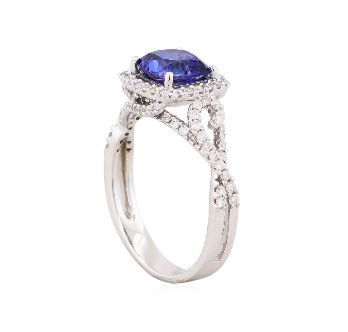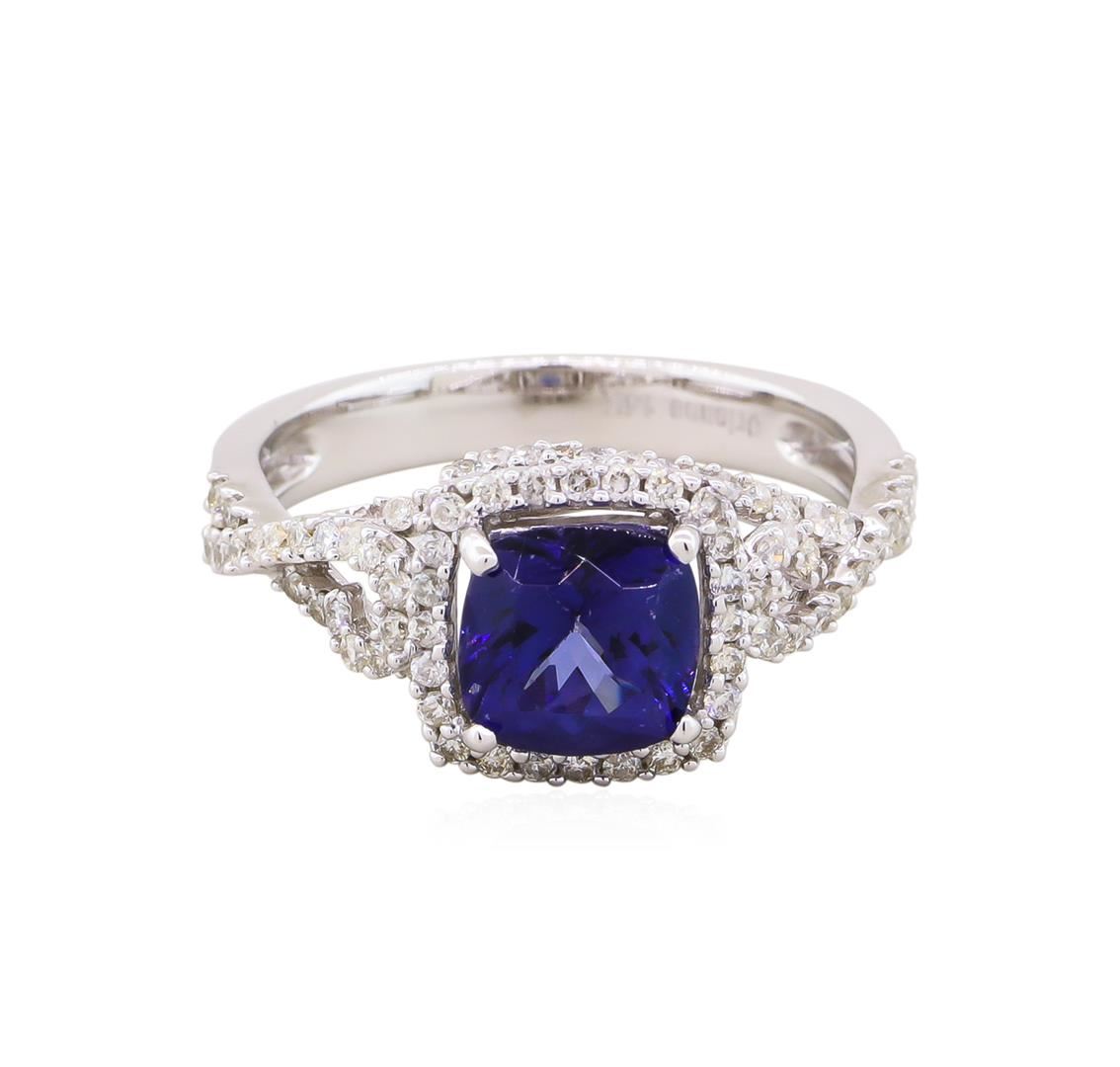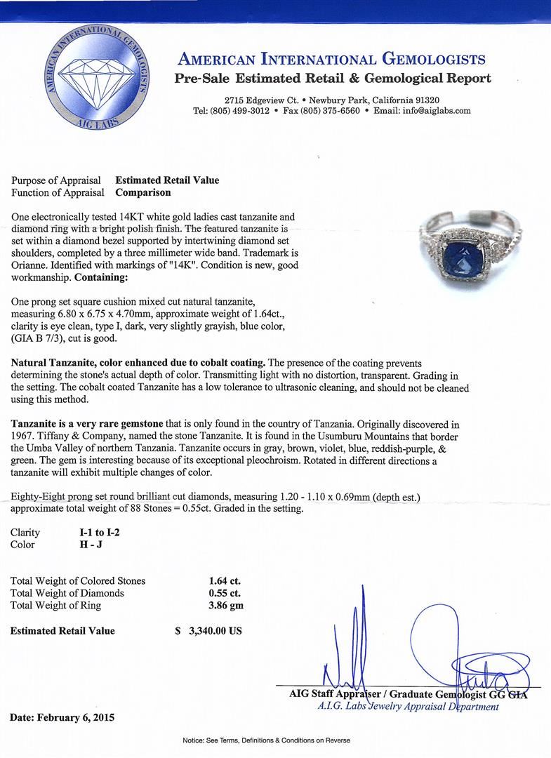 One prong set square cushion mixed cut natural tanzanite, measuring 6.80 x 6.75 x 4.70mm, approximate weight of 1.64ct., clarity is eye clean, type I, dark, very slightly grayish, blue color, (GIA B 7/3), cut is good. Natural Tanzanite, color enhanced due to cobalt coating. The presence of the coating prevents determining the stone's actual depth of color. Transmitting light with no distortion, transparent. Grading in the setting. The cobalt coated Tanzanite has a low tolerance to ultrasonic cleaning, and should not be cleaned using this method. Tanzanite is a very rare gemstone that is only found in the country of Tanzania. Originally discovered in 1967. Tiffany & Company, named the stone Tanzanite. It is found in the Usumburu Mountains that border the Umba Valley of northern Tanzania. Tanzanite occurs in gray, brown, violet, blue, reddish-purple, & green. The gem is interesting because of its exceptional pleochroism. Rotated in different directions a tanzanite will exhibit multiple changes of color.Eighty-Eight prong set round brilliant cut diamonds, measuring 1.20 - 1.10 x 0.69mm (depth est.) approximate. Total Weight of 88 Stones = 0.55ct. Graded in the setting. Clarity: I-1 to I-2. Color: H - J. Total Weight of Colored Stones 1.64ct. Total Weight of Diamonds 0.55ct. AIG Appraised at $3,340.00.