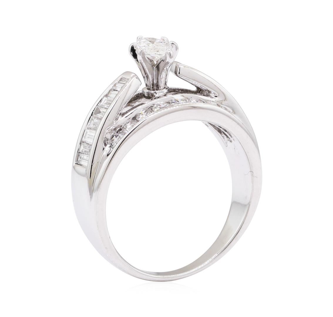 One electronically tested 14KT white gold lady's combination cast & assembled three row wedding ring with a cathedral shank with a bright polish finish. The featured lady's ring has a shank measuring 2.50 millimeters wide. Trademark is ZEI. Identified with markings of '14K'. Condition is like new, good workmanship. Containing: One prong set marquise shaped cut diamond, measuring 7.00 x 3.72 x 2.34mm (depth est.) approximate weight of 0.35ct. Graded in the setting. Color H, Clarity SI-2 Cut Good Sixteen channel set round brilliant cut diamonds, measuring 2.30 - 2.20 x 1.40mm (depth est.) approximate total weight of 16 Stones = 0.70ct. Graded in the setting. Color H - I, Clarity SI-1 to SI-2, Cut Very Good Eighteen channel set baguette cut diamonds, measuring from 2.00 x 1.00 x 0.85mm (depth est.) to 3.20 x 1.50 x 1.28mm (depth est.) approximate total weight of 18 Stones = 0.60ct. Graded in the setting. Color H - I, Clarity SI-1 to I-1 Cut Good. Total Weight of Diamonds 1.65ct. Total Weight of Ring 7.40gm. GAS Appraised.