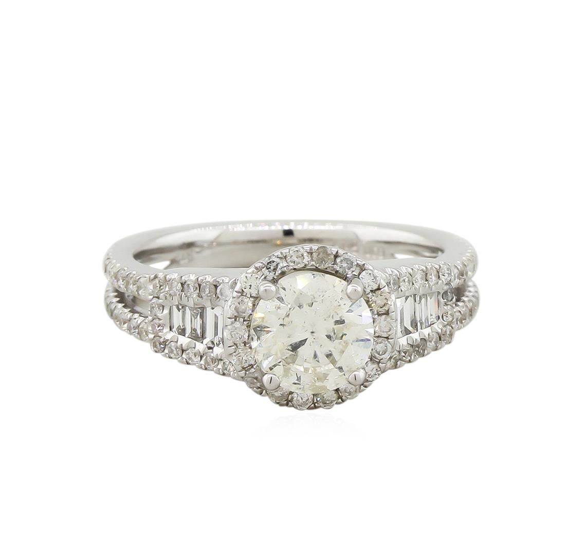 One electronically tested 14KT white gold ladies cast diamond unity ring with a bright polish finish. The featured diamond is set within a diamond bezel supported by a lattice under gallery and stylized split diamond shoulders, completed by a two millimeter wide band. Trademark is UCG. Identified with markings of "14K 585". Condition is new, good workmanship. Containing: One prong set round brilliant cut diamond, measuring 6.50 - 6.50 x 3.80mm (depth est.), 4.00.%. GTCF approximate weight of 1.02ct with a strong blue fluorescence. Graded in the setting. Clarity: I-1. Color: JDepth 58.5%. Table 60.0%. Six channel set baguette cut (tapered) diamonds, measuring from 1.80 x 0.90 x 0.63mm (depth est.) to 2.50 x 1.20 x 0.84mm (depth est.) approximate. Total Weight of 6 Stones = 0.16ct. Graded in the setting. Clarity: VS-2. Color: G - H Seventy-Eight prong set round brilliant cut diamonds, measuring 1.20 - 1.00 x 0.66mm (depth est.) approximate. Total Weight of 78 Stones = 0.47ct. Graded in the setting. Clarity: I-1 to I-2. Color: G - I. Total Weight of Diamonds 1.65ct. Total Weight of Ring 4.72gm. AIG Appraised at $11,815.00.