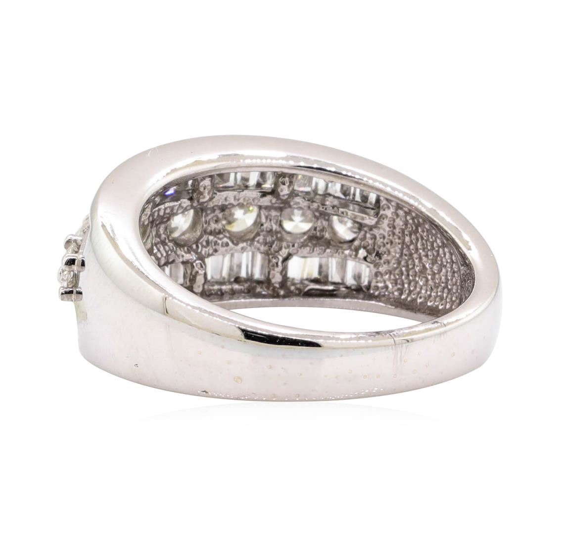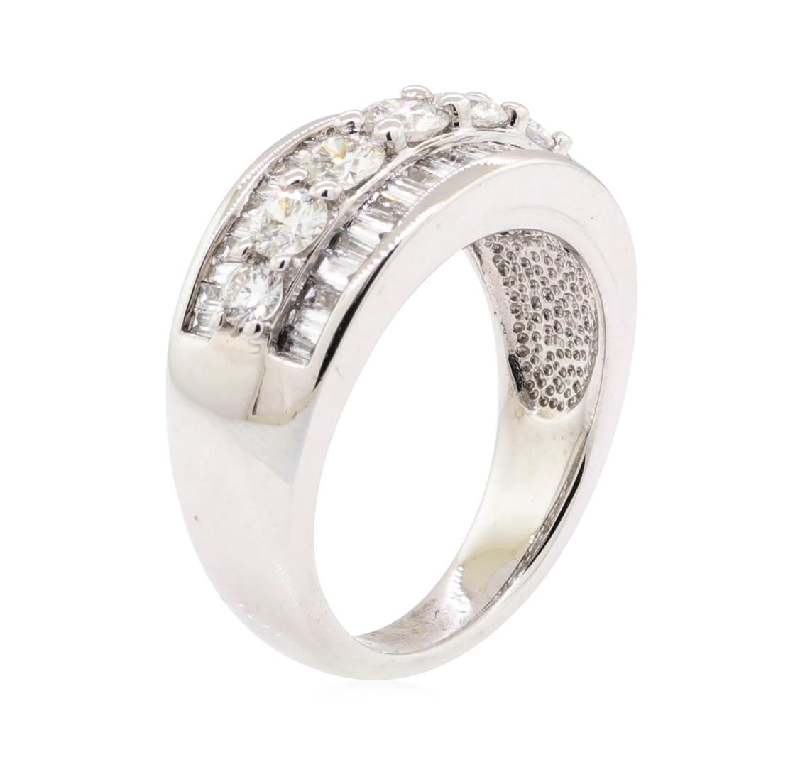One electronically tested 14KT white gold Ladies cast fashion wedding band with a three row tapered shank with a bright polish finish. The featured Ladies ring has a shank measuring 3.40 millimeters in width. Identified with markings of '14K'. Condition is new, good workmanship. Containing: Seven prong set round brilliant cut diamonds, measuring 3.40 - 2.80 x 1.89mm (depth est.) approximate total weight of 7 Stones = 0.80ct. Graded in the setting. Color H - I Clarity SI-1 to SI-2 Cut Very Good Forty-Two channel set baguette cut (tapered) diamonds, measuring from 1.80 x 1.00 x 0.85mm (depth est.) to 2.20 x 1.30 x 1.11mm (depth est.) approximate total weight of 42 Stones = 0.86ct. Graded in the setting. Color H - I Clarity VS-2 to SI-2 Cut Very Good. Total Weight of Diamonds 1.66ct.. Total Weight of Wedding Band 8.00gm. GAS Appraised.