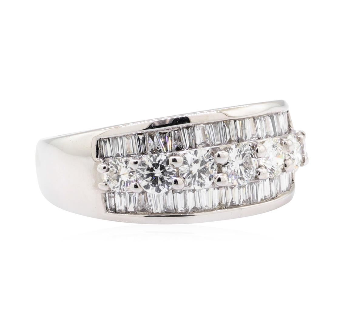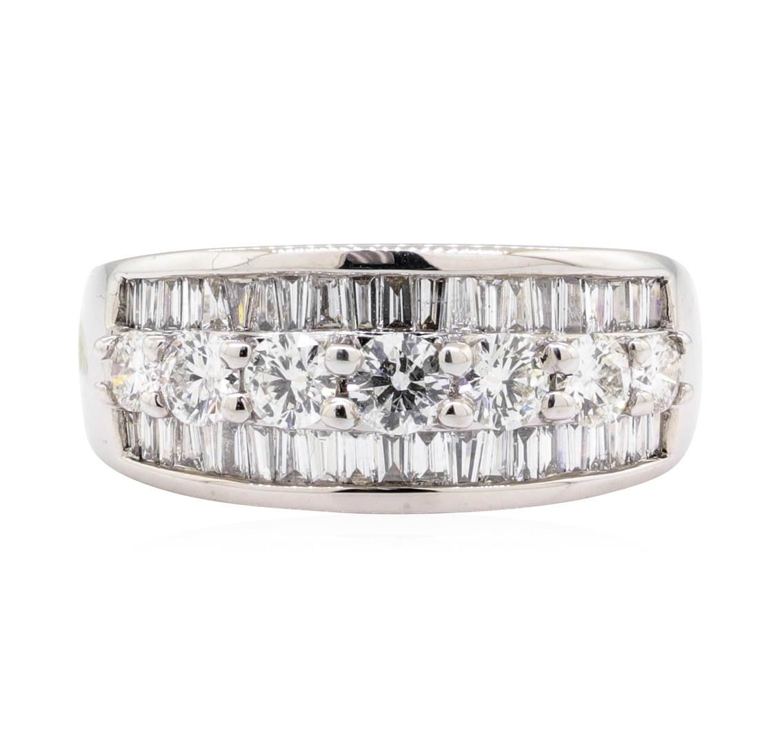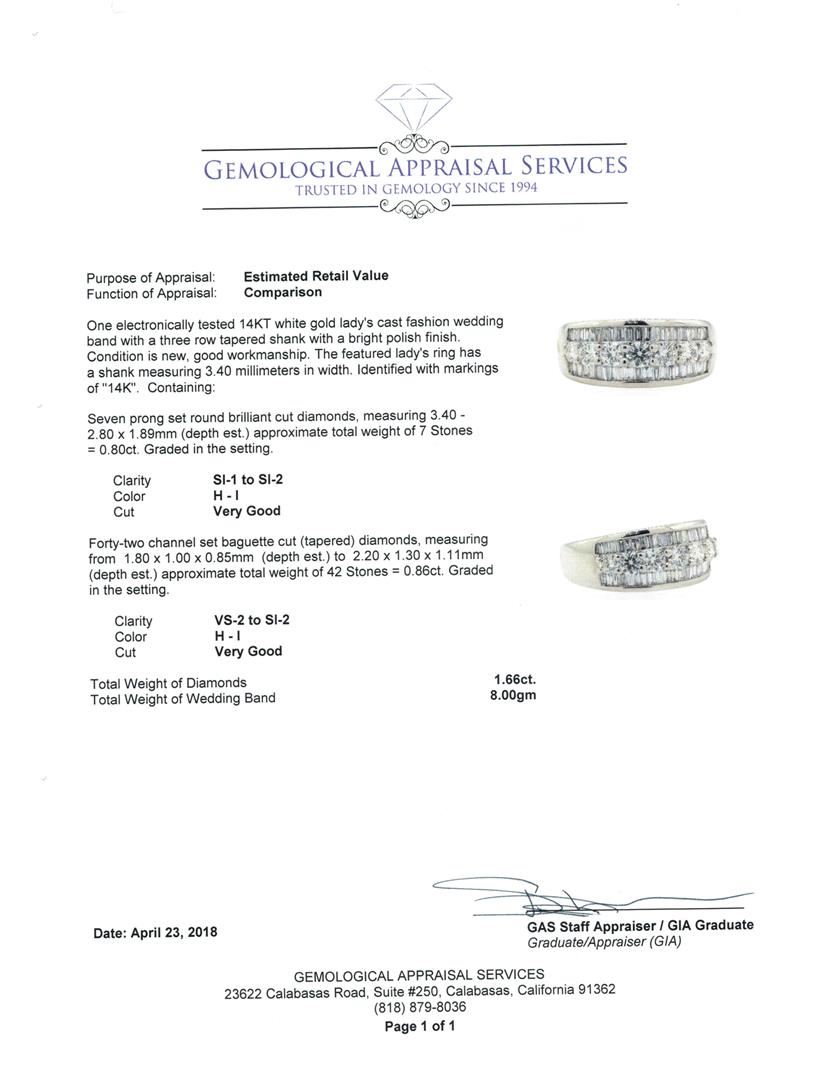 One electronically tested 14KT white gold Ladies cast fashion wedding band with a three row tapered shank with a bright polish finish. The featured Ladies ring has a shank measuring 3.40 millimeters in width. Identified with markings of '14K'. Condition is new, good workmanship. Containing: Seven prong set round brilliant cut diamonds, measuring 3.40 - 2.80 x 1.89mm (depth est.) approximate total weight of 7 Stones = 0.80ct. Graded in the setting. Color H - I Clarity SI-1 to SI-2 Cut Very Good Forty-Two channel set baguette cut (tapered) diamonds, measuring from 1.80 x 1.00 x 0.85mm (depth est.) to 2.20 x 1.30 x 1.11mm (depth est.) approximate total weight of 42 Stones = 0.86ct. Graded in the setting. Color H - I Clarity VS-2 to SI-2 Cut Very Good. Total Weight of Diamonds 1.66ct.. Total Weight of Wedding Band 8.00gm. GAS Appraised.