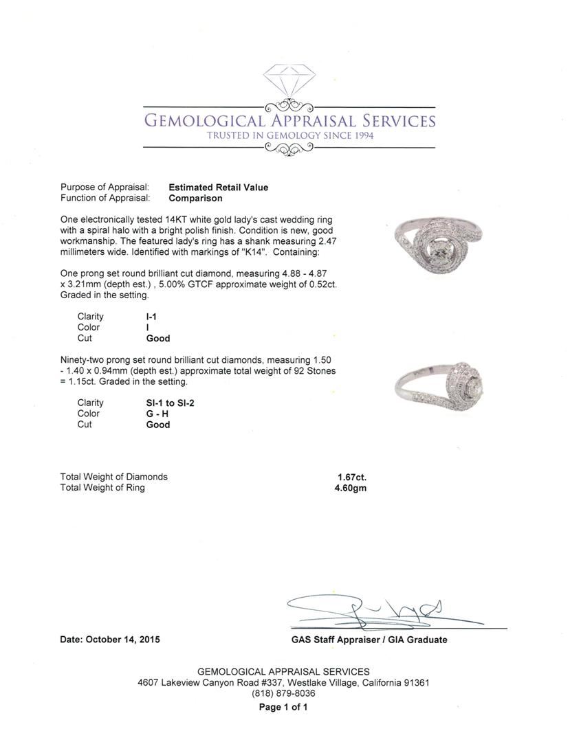 One electronically tested 14KT white gold lady's cast wedding ring with a spiral halo with a bright polish finish. The featured lady's ring has a shank measuring 2.47 millimeters wide. Identified with markings of "K14". Condition is new, good workmanship. Containing: One prong set round brilliant cut diamond, measuring 4.88 - 4.87 x 3.21mm (depth est.) , 5.00% GTCF approximate weight of 0.52ct. Graded in the setting. Clarity: I-1. Color: I. Cut Good Ninety-Two prong set round brilliant cut diamonds, measuring 1.50 - 1.40 x 0.94mm (depth est.) approximate total weight of 92 Stones = 1.15ct. Graded in the setting. Clarity: SI-1 to SI-2. Color: G - H. Cut Good. Total Weight of Diamonds 1.67ct. Total Weight of Ring 4.60gm. GAS Appraised.