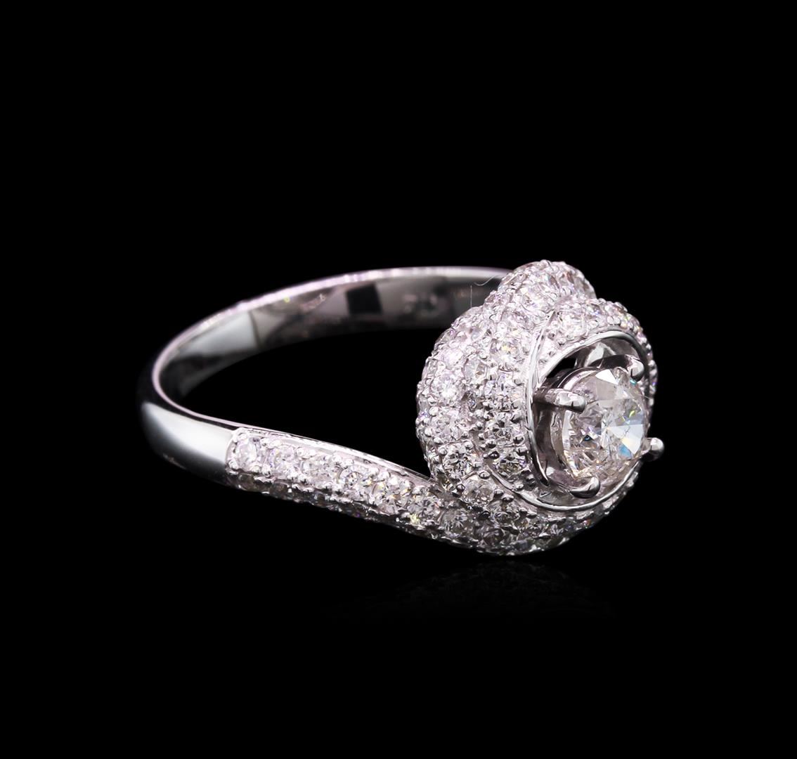 One electronically tested 14KT white gold lady's cast wedding ring with a spiral halo with a bright polish finish. The featured lady's ring has a shank measuring 2.47 millimeters wide. Identified with markings of "K14". Condition is new, good workmanship. Containing: One prong set round brilliant cut diamond, measuring 4.88 - 4.87 x 3.21mm (depth est.) , 5.00% GTCF approximate weight of 0.52ct. Graded in the setting. Clarity: I-1. Color: I. Cut Good Ninety-Two prong set round brilliant cut diamonds, measuring 1.50 - 1.40 x 0.94mm (depth est.) approximate total weight of 92 Stones = 1.15ct. Graded in the setting. Clarity: SI-1 to SI-2. Color: G - H. Cut Good. Total Weight of Diamonds 1.67ct. Total Weight of Ring 4.60gm. GAS Appraised.