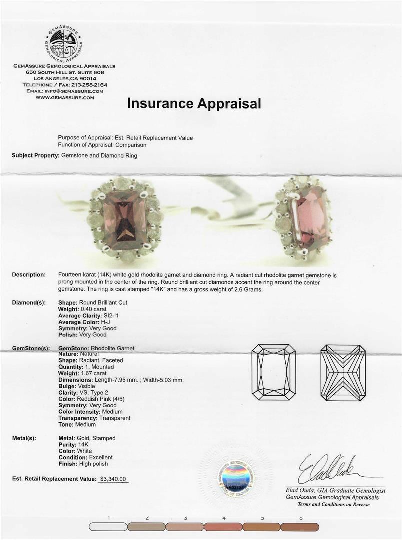 Fourteen karat (14K) white gold rhodolite garnet and diamond ring. A radiant cut rhodolite garnet gemstone is prong mounted in the center of the ring. Round brilliant cut diamonds accent the ring around the center gemstone. The ring is cast stamped "14K" and has a gross weight of 2.6 Grams. Diamonds with a total weight of 0.40cts with a clarity of (SI1-I1) and color of (H-J). GA Appraised at $3,340.00.