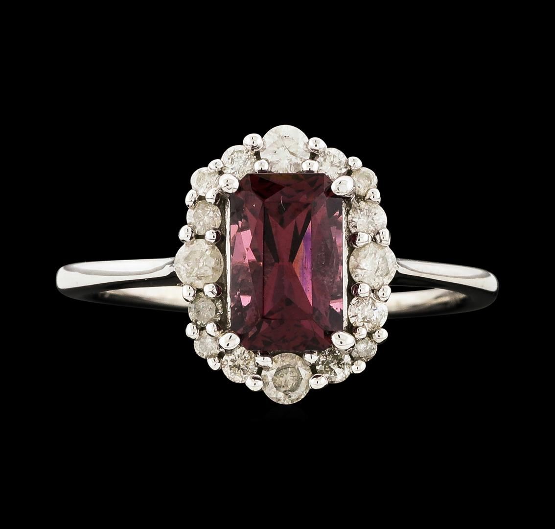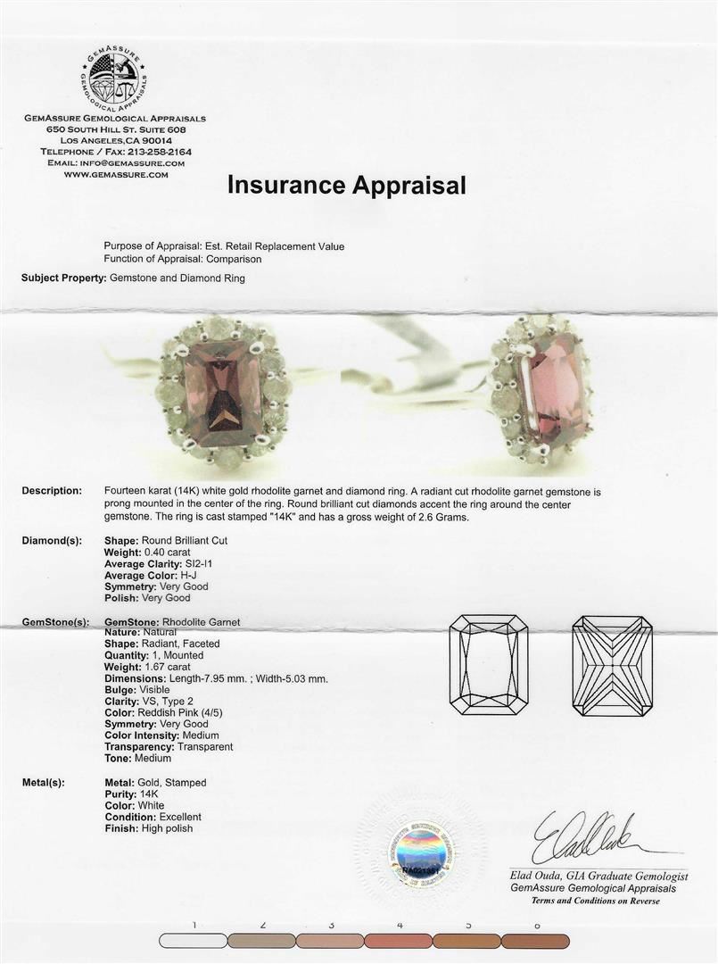 Fourteen karat (14K) white gold rhodolite garnet and diamond ring. A radiant cut rhodolite garnet gemstone is prong mounted in the center of the ring. Round brilliant cut diamonds accent the ring around the center gemstone. The ring is cast stamped "14K" and has a gross weight of 2.6 Grams. Diamonds with a total weight of 0.40cts with a clarity of (SI1-I1) and color of (H-J). GA Appraised.