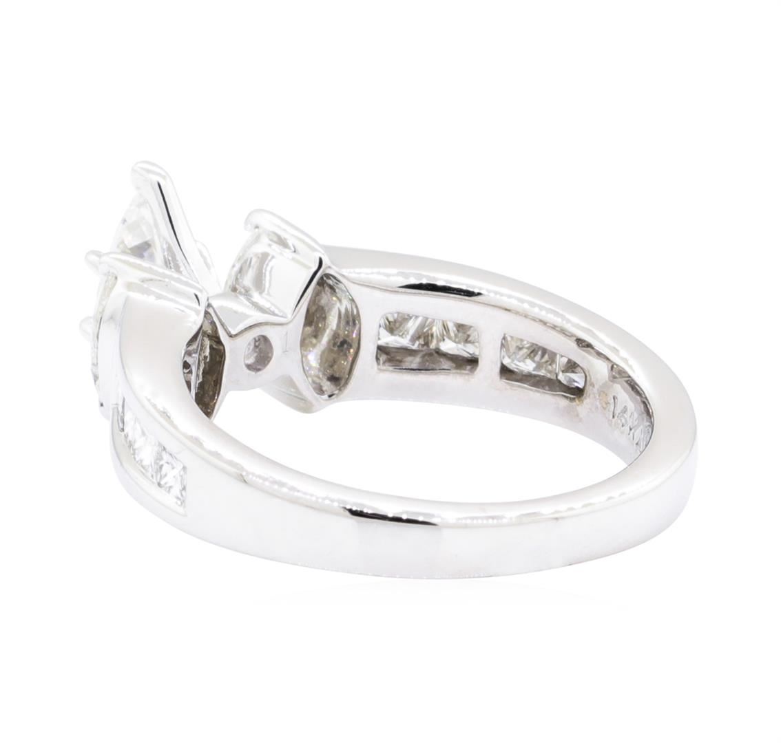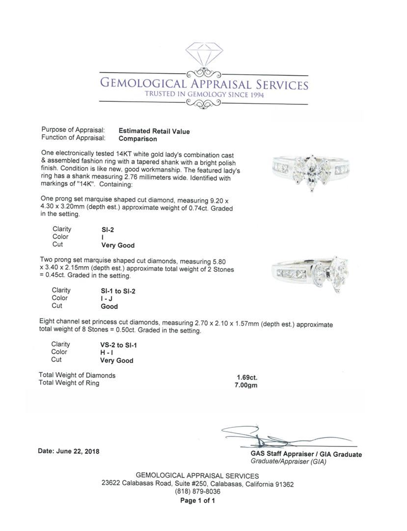 One electronically tested 14KT white gold lady's combination cast & assembled fashion ring with a tapered shank with a bright polish finish. The featured lady's ring has a shank measuring 2.76 millimeters wide. Identified with markings of '14K'. Condition is like new, good workmanship. Containing: One prong set marquise shaped cut diamond, measuring 9.20 x 4.30 x 3.20mm (depth est.) approximate weight of 0.74ct. Graded in the setting. Color I Clarity SI-2 Cut Very Good Two prong set marquise shaped cut diamonds, measuring 5.80 x 3.40 x 2.15mm (depth est.) approximate total weight of 2 Stones = 0.45ct. Graded in the setting. Color I - J Clarity SI-1 to SI-2 Cut Good Eight channel set princess cut diamonds, measuring 2.70 x 2.10 x 1.57mm (depth est.) approximate total weight of 8 Stones = 0.50ct. Graded in the setting. Color H - I Clarity VS-2 to SI-1 Cut Very Good. Total Weight of Diamonds 1.69ct. Total Weight of Ring 7.00gm. GAS Appraised.