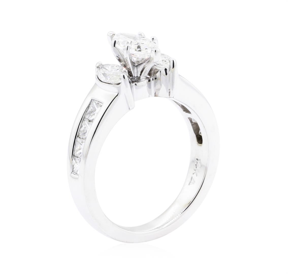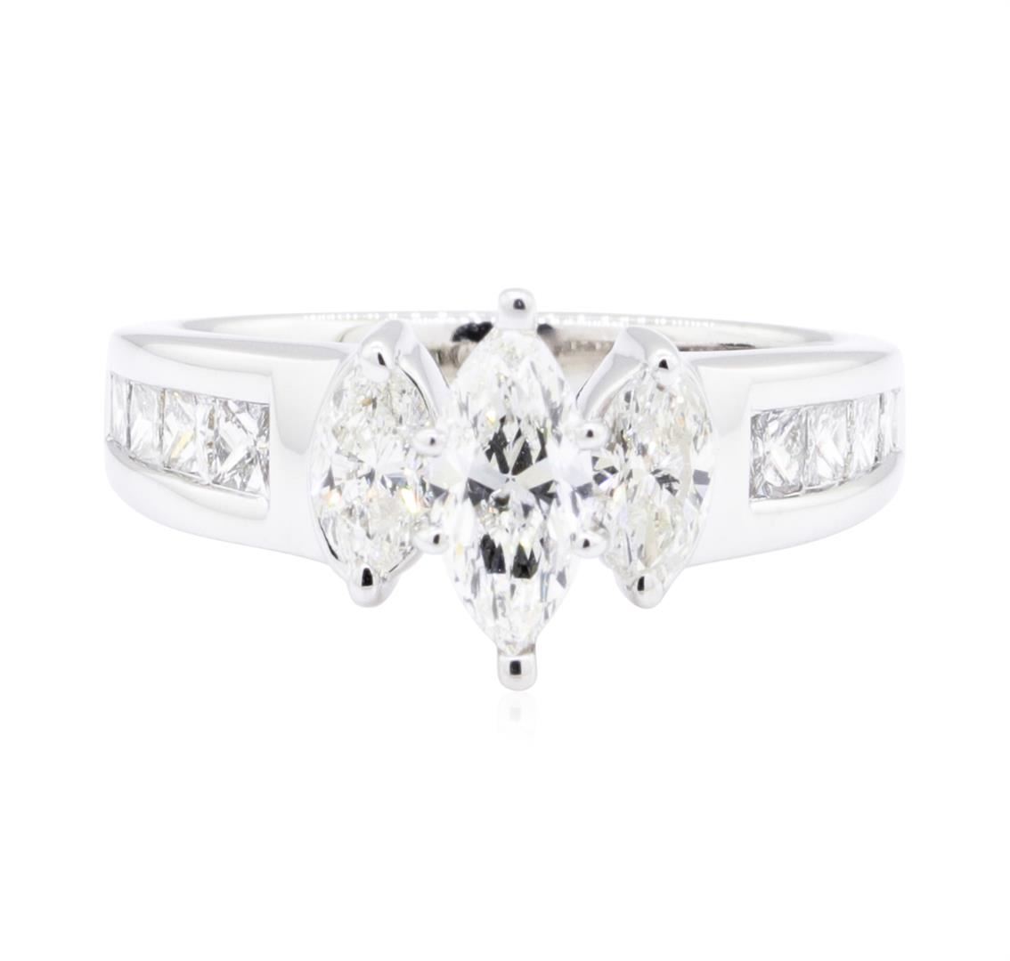 One electronically tested 14KT white gold lady's combination cast & assembled fashion ring with a tapered shank with a bright polish finish. The featured lady's ring has a shank measuring 2.76 millimeters wide. Identified with markings of '14K'. Condition is like new, good workmanship. Containing: One prong set marquise shaped cut diamond, measuring 9.20 x 4.30 x 3.20mm (depth est.) approximate weight of 0.74ct. Graded in the setting. Color I Clarity SI-2 Cut Very Good Two prong set marquise shaped cut diamonds, measuring 5.80 x 3.40 x 2.15mm (depth est.) approximate total weight of 2 Stones = 0.45ct. Graded in the setting. Color I - J Clarity SI-1 to SI-2 Cut Good Eight channel set princess cut diamonds, measuring 2.70 x 2.10 x 1.57mm (depth est.) approximate total weight of 8 Stones = 0.50ct. Graded in the setting. Color H - I Clarity VS-2 to SI-1 Cut Very Good. Total Weight of Diamonds 1.69ct. Total Weight of Ring 7.00gm. GAS Appraised.
