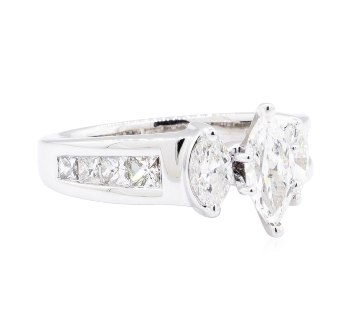 One electronically tested 14KT white gold lady's combination cast & assembled fashion ring with a tapered shank with a bright polish finish. The featured lady's ring has a shank measuring 2.76 millimeters wide. Identified with markings of '14K'. Condition is like new, good workmanship. Containing: One prong set marquise shaped cut diamond, measuring 9.20 x 4.30 x 3.20mm (depth est.) approximate weight of 0.74ct. Graded in the setting. Color I Clarity SI-2 Cut Very Good Two prong set marquise shaped cut diamonds, measuring 5.80 x 3.40 x 2.15mm (depth est.) approximate total weight of 2 Stones = 0.45ct. Graded in the setting. Color I - J Clarity SI-1 to SI-2 Cut Good Eight channel set princess cut diamonds, measuring 2.70 x 2.10 x 1.57mm (depth est.) approximate total weight of 8 Stones = 0.50ct. Graded in the setting. Color H - I Clarity VS-2 to SI-1 Cut Very Good. Total Weight of Diamonds 1.69ct. Total Weight of Ring 7.00gm. GAS Appraised.
