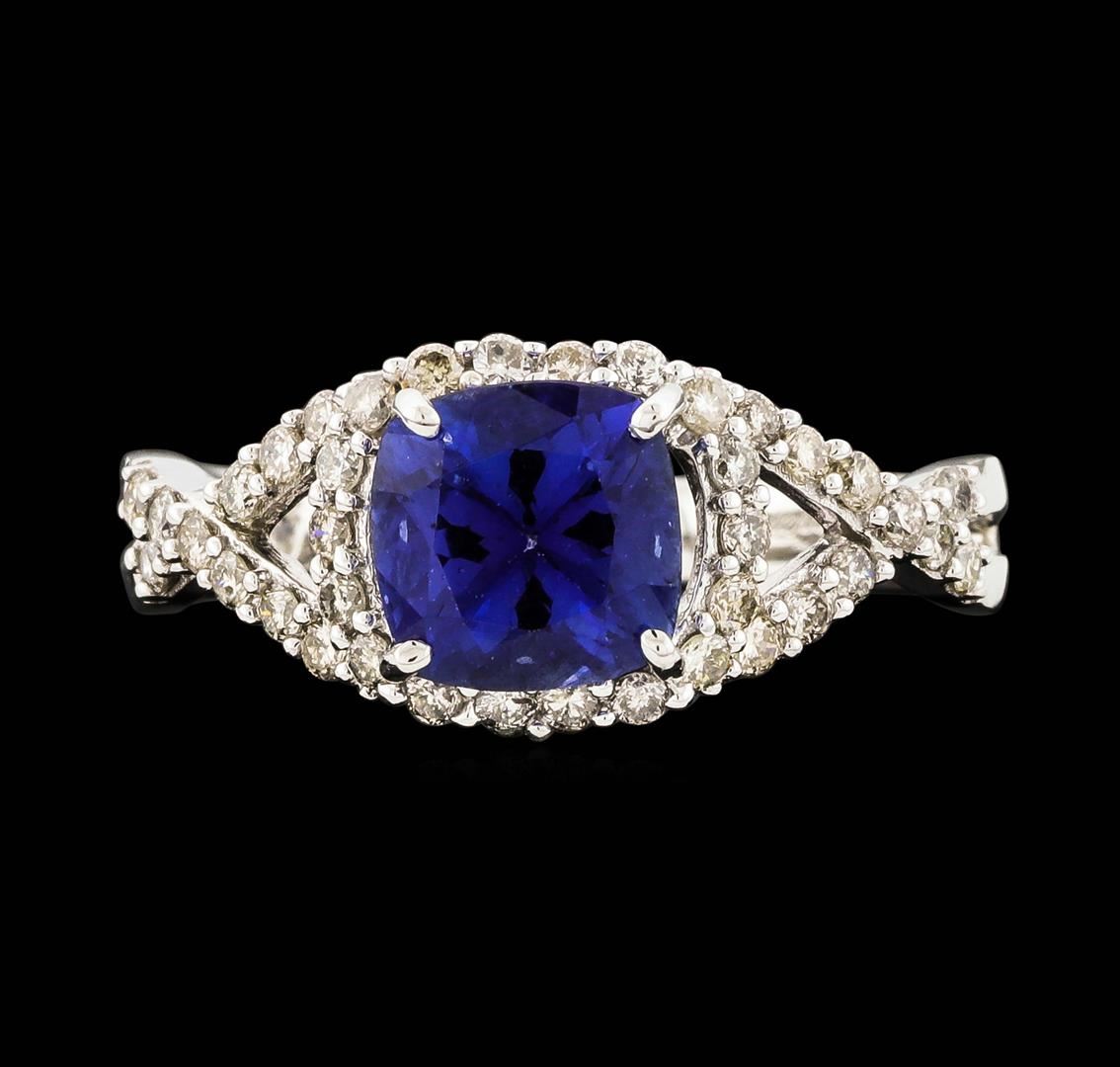 One electronically tested 14KT white gold ladies cast tanzanite and diamond ring with a bright polish finish. The featured tanzanite is set within a diamond bezel supported by intertwining diamond set shoulder, completed by two and one-half millimeter wide band. Trademark is Orianne. Identified with markings of "14K". Condition is new, good workmanship. Containing: One prong set square cushion mixed cut natural tanzanite, measuring 6.84 x 6.80 x 4.75mm, approximate weight of 1.69ct., clarity is eye clean, type I, dark, very slightly grayish, blue color, (GIA B 7/3), cut is good. Natural Tanzanite, color enhanced due to cobalt coating. The presence of the coating prevents determining the stone's actual depth of color. Transmitting light with no distortion, transparent. Grading in the setting. The cobalt coated Tanzanite has a low tolerance to ultrasonic cleaning, and should not be cleaned using this method. Tanzanite is a very rare gemstone that is only found in the country of Tanzania. Originally discovered in 1967. Tiffany & Company, named the stone Tanzanite. It is found in the Usumburu Mountains that border the Umba Valley of northern Tanzania. Tanzanite occurs in gray, brown, violet, blue, reddish-purple, & green. The gem is interesting because of its exceptional pleochroism. Rotated in different directions a tanzanite will exhibit multiple changes of color. Thirty-Eight prong set round brilliant cut diamonds, measuring 1.50 - 1.40 x 0.87mm (depth est.) approximate total weight of 38 Stones = 0.45ct. Color grade is an average for the group. Graded in the setting. Clarity: SI-1 to I-1. Total Weight of Colored Stones 1.69ct. Total Weight of Diamonds 0.45ct. Total Weight of Ring 3.51gm. AIG Appraised.