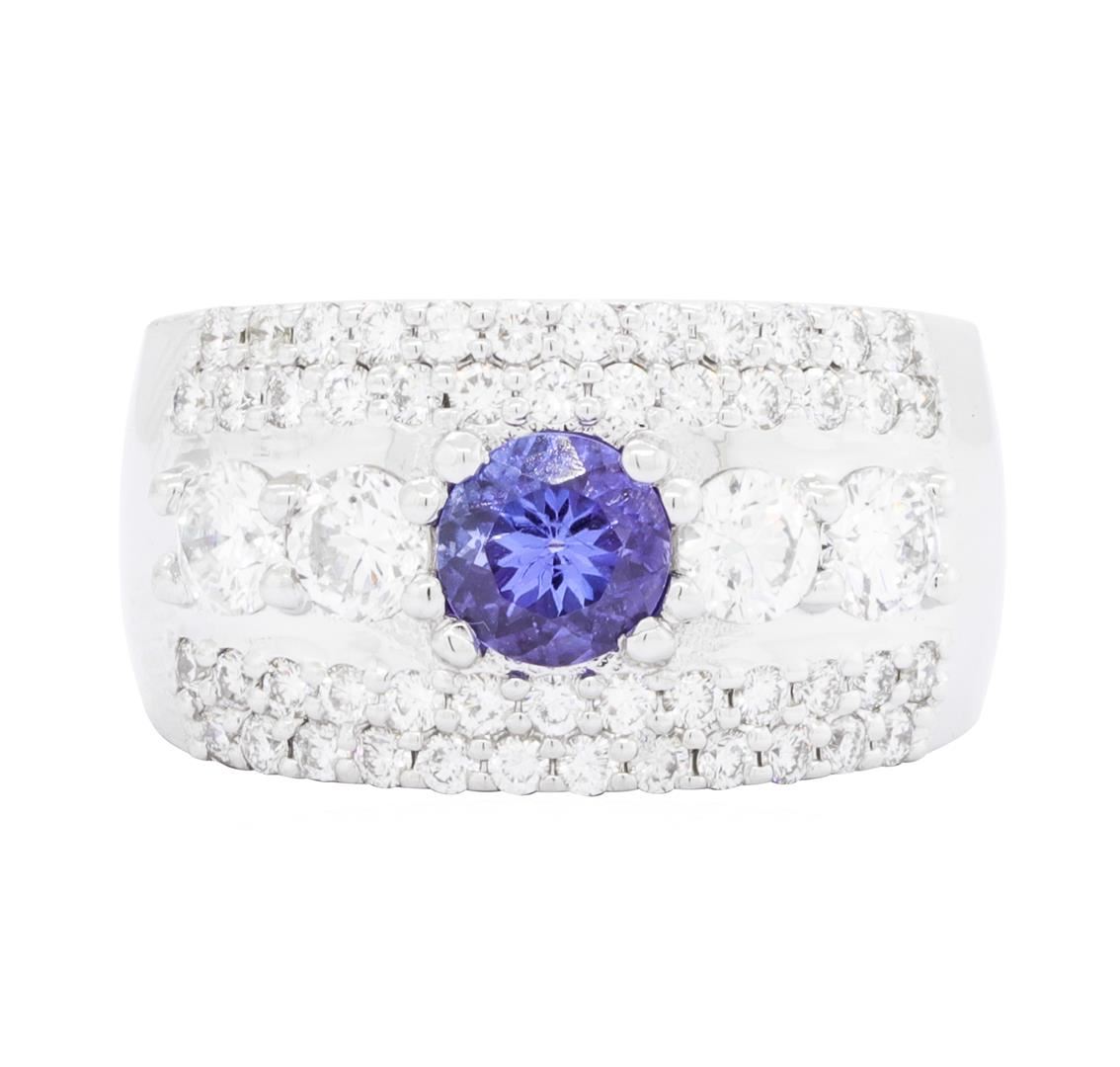 One electronically tested 14KT white gold Ladies cast fashion ring with a tapered shank with a bright polish finish. The featured Ladies ring has a shank measuring 7.62 millimeters wide. Identified with markings of '14K'. Condition is new, good workmanship. Containing: One prong set round modified brilliant cut natural tanzanite, measuring 5.74 - 5.70 x 4.18 mm, (depth est.) approximate weight of 0.84ct., clarity is eye clean, medium, moderately strong, bluish violet color, (GIA bV 5/4), cut is good. Transmitting light with no distortion, transparent. Colored gemstones are presumed to have been subjected to commonly used enhancement processes. Graded in the setting. Four prong set round brilliant cut diamonds, measuring 4.10 - 3.95 x 2.50mm (depth est.) approximate total weight of 4 Stones = 1.00ct. Graded in the setting. Color H - I Clarity SI-1 to SI-2 Cut Very Good Fifty prong set round brilliant cut diamonds, measuring 1.60 - 1.55 x 0.95mm (depth est.) approximate total weight of 50 Stones = 0.72ct. Graded in the setting. Color H - I Clarity VS-2 to SI-2 Cut Good. Total Weight of Colored Stones 0.84ct. Total Weight of Diamonds 1.72ct. Total Weight of Ring 10.50gm. GAS Appraised.