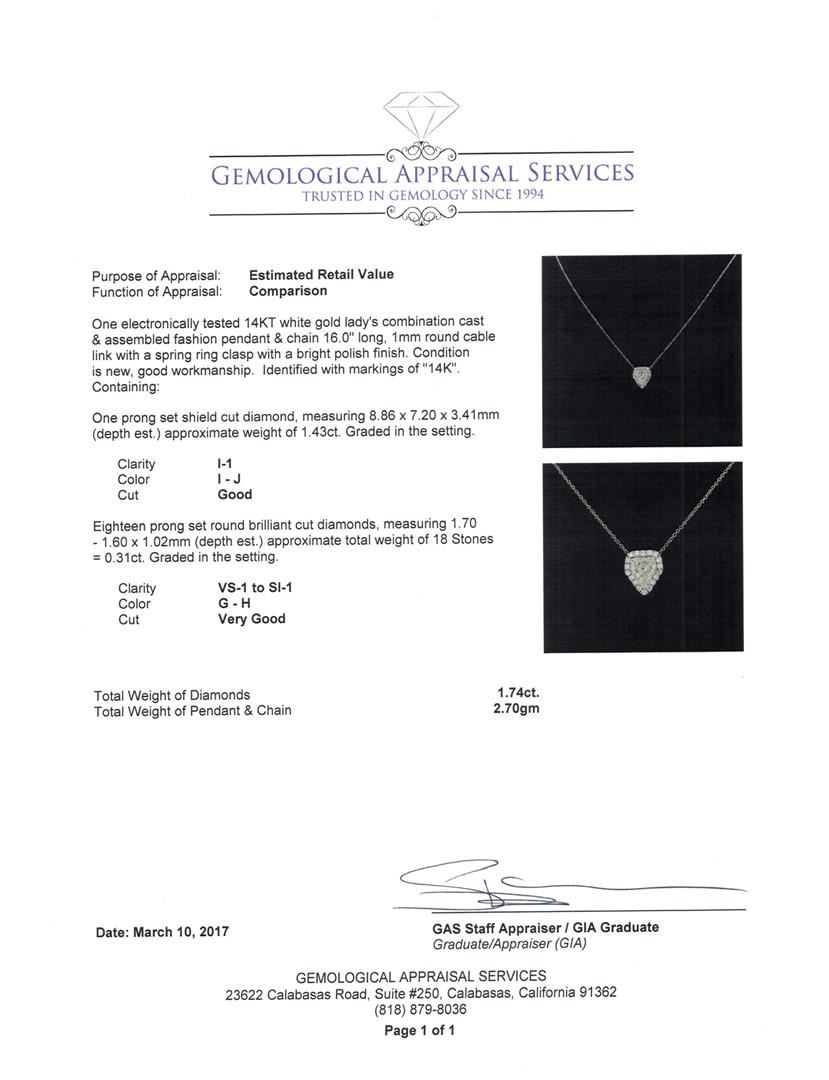 One electronically tested 14KT white gold lady's combination cast & assembled fashion pendant & chain 16.0" long, 1mm round cable link with a spring ring clasp with a bright polish finish. Identified with markings of "14K". Condition is new, good workmanship. Containing: One prong set shield cut diamond, measuring 8.86 x 7.20 x 3.41mm (depth est.) approximate weight of 1.43ct. Graded in the setting. Color I - JClarity I-1 Cut Good Eighteen prong set round brilliant cut diamonds, measuring 1.70 - 1.60 x 1.02mm (depth est.) approximate total weight of 18 Stones = 0.31ct. Graded in the setting. Color G - HClarity VS-1 to SI-1 Cut Very Good. Total Weight of Diamonds 1.74ct. Total Weight of Pendant & Chain 2.70gm. GAS Appraised.