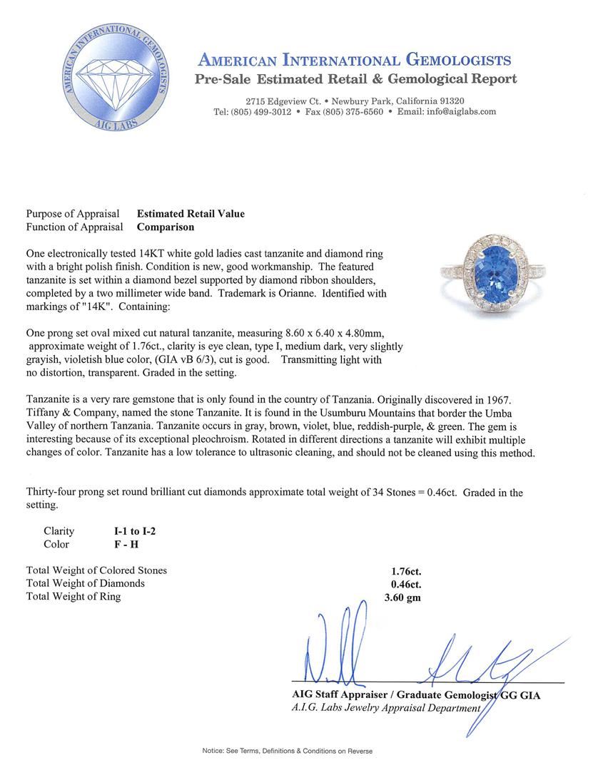 One electronically tested 14KT white gold ladies cast tanzanite and diamond ring with a bright polish finish. The featured tanzanite is set within a diamond bezel supported by diamond ribbon shoulders, completed by a two millimeter wide band. Trademark is Orianne. Identified with markings of "14K". Condition is new, good workmanship. Containing: One prong set oval mixed cut natural tanzanite, measuring 8.60 x 6.40 x 4.80mm, approximate weight of 1.76ct., clarity is eye clean, type I, medium dark, very slightly grayish, violetish blue color, (GIA vB 6/3), cut is good. Transmitting light with no distortion, transparent. Graded in the setting.Tanzanite is a very rare gemstone that is only found in the country of Tanzania. Originally discovered in 1967. Tiffany & Company, named the stone Tanzanite. It is found in the Usumburu Mountains that border the Umba Valley of northern Tanzania. Tanzanite occurs in gray, brown, violet, blue, reddish-purple, & green. The gem is interesting because of its exceptional pleochroism. Rotated in different directions a tanzanite will exhibit multiple changes of color. Tanzanite has a low tolerance to ultrasonic cleaning, and should not be cleaned using this method.Thirty-Four prong set round brilliant cut diamonds approximate total weight of 34 Stones = 0.46ct. Graded in the setting. Clarity: I-1 to I-2. Color: F - H. Total Weight of Colored Stones 1.76ct. Total Weight of Diamonds 0.46ct. Total Weight of Ring 3.60gm. AIG Appraised.