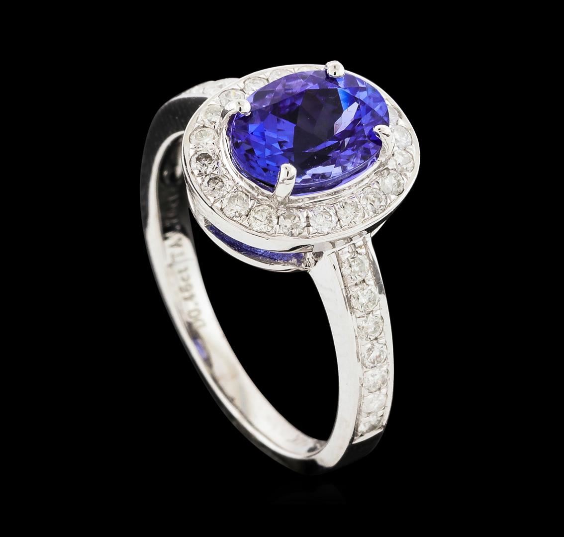 One electronically tested 14KT white gold ladies cast tanzanite and diamond ring with a bright polish finish. The featured tanzanite is set within a diamond bezel supported by diamond ribbon shoulders, completed by a two millimeter wide band. Trademark is Orianne. Identified with markings of "14K". Condition is new, good workmanship. Containing: One prong set oval mixed cut natural tanzanite, measuring 8.60 x 6.40 x 4.80mm, approximate weight of 1.76ct., clarity is eye clean, type I, medium dark, very slightly grayish, violetish blue color, (GIA vB 6/3), cut is good. Transmitting light with no distortion, transparent. Graded in the setting.Tanzanite is a very rare gemstone that is only found in the country of Tanzania. Originally discovered in 1967. Tiffany & Company, named the stone Tanzanite. It is found in the Usumburu Mountains that border the Umba Valley of northern Tanzania. Tanzanite occurs in gray, brown, violet, blue, reddish-purple, & green. The gem is interesting because of its exceptional pleochroism. Rotated in different directions a tanzanite will exhibit multiple changes of color. Tanzanite has a low tolerance to ultrasonic cleaning, and should not be cleaned using this method.Thirty-Four prong set round brilliant cut diamonds approximate total weight of 34 Stones = 0.46ct. Graded in the setting. Clarity: I-1 to I-2. Color: F - H. Total Weight of Colored Stones 1.76ct. Total Weight of Diamonds 0.46ct. Total Weight of Ring 3.60gm. AIG Appraised.