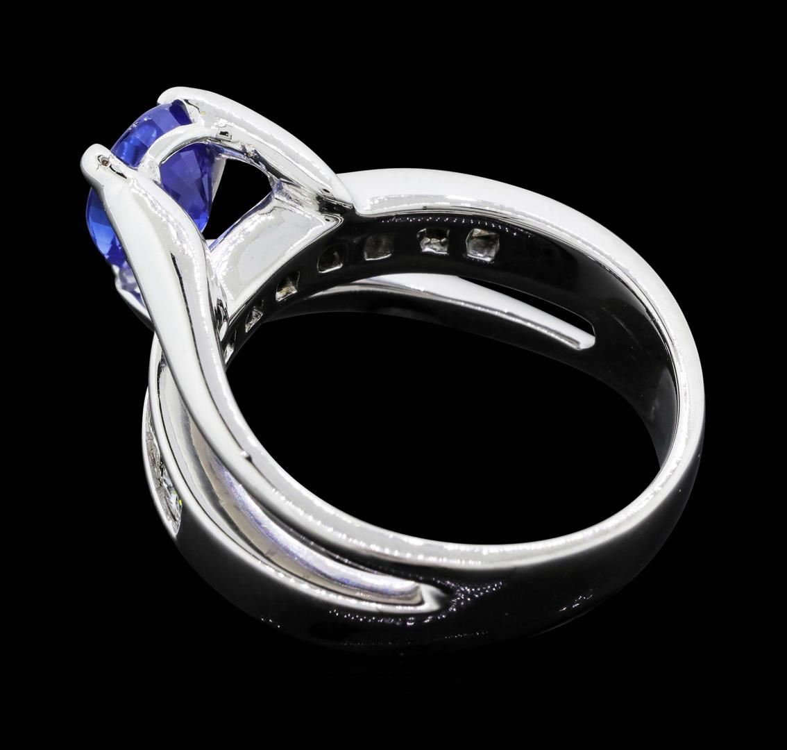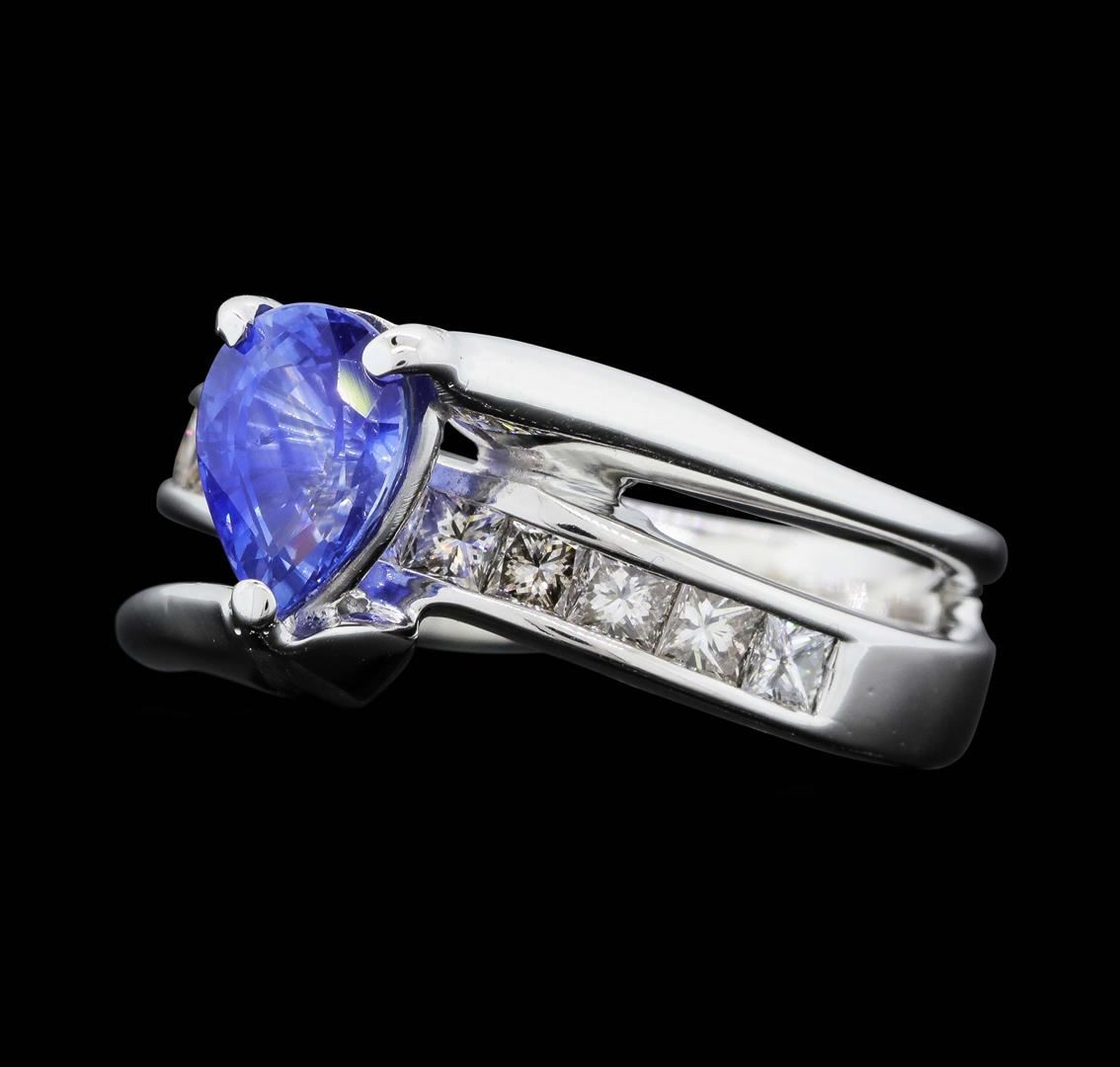 One electronically tested 14KT white gold lady's cast fashion ring with a split bypass shank with a bright polish finish. The featured lady's ring has a shank measuring 4.11 millimeters wide. Condition is new, good workmanship. Containing: One prong set pear modified mixed cut natural blue sapphire, measuring 8.35 x 6.05 x 4.40mm, (depth est.) approximate weight of 1.78ct., clarity is moderately included, medium light, very slightly grayish, blue color, (GIA B 4/3), cut is good. Transmitting light somewhat diffusely, transparent to translucent. Colored gemstones are presumed to have been subjected to commonly used enhancement processes. Graded in the setting. Eleven channel set princess cut diamonds, measuring 2.60 x 2.40 x 1.80mm (depth est.) approximate total weight of 11 Stones = 1.00ct. Graded in the setting. Color J - KClarity SI-1 to SI-3 Cut Very Good. Total Weight of Colored Stones 1.78ct. Total Weight of Diamonds 1.00ct. Total Weight of Ring 8.40gm. GAS Appraised.