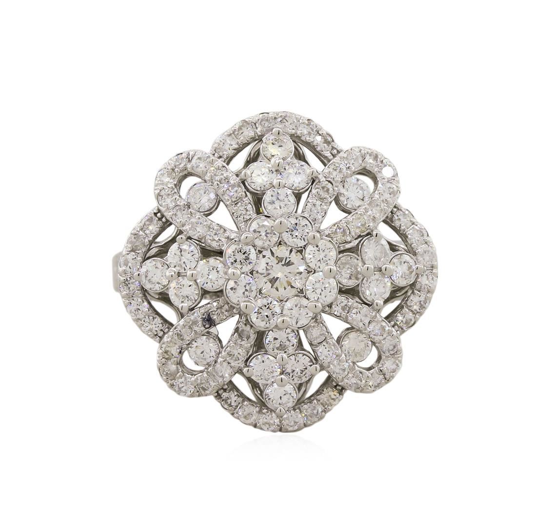 One electronically tested 14KT white gold lady's cast fashion ring with a split shank with a bright polish finish. The featured lady's ring has a shank measuring 1.82 millimeters in width Identified with markings of "K14". Condition is new, good workmanship. Containing: One prong set round brilliant cut diamond, measuring 3.60 - 3.55 x 2.16mm (depth est.) approximate weight of 0.18ct. Graded in the setting. Clarity: SI-1 . Color: Very Good Twenty-Eight prong set round brilliant cut diamonds, measuring 2.00 - 1.90 x 1.27mm (depth est.) approximate total weight of 28 Stones = 0.85ct. Graded in the setting. Clarity: SI-1 to I-1 . Color: H - I. Cut Good Eighty-Eight prong set round brilliant cut diamonds, measuring 1.30 - 1.25 x 0.83mm (depth est.) approximate total weight of 88 Stones = 0.75ct. Graded in the setting. Clarity: SI-1 to I-1 . Color: H - I. Cut Good. Total Weight of Diamonds 1.78ct. Total Weight of Ring 5.60 grams. GAS Appraised at $6,160.00.