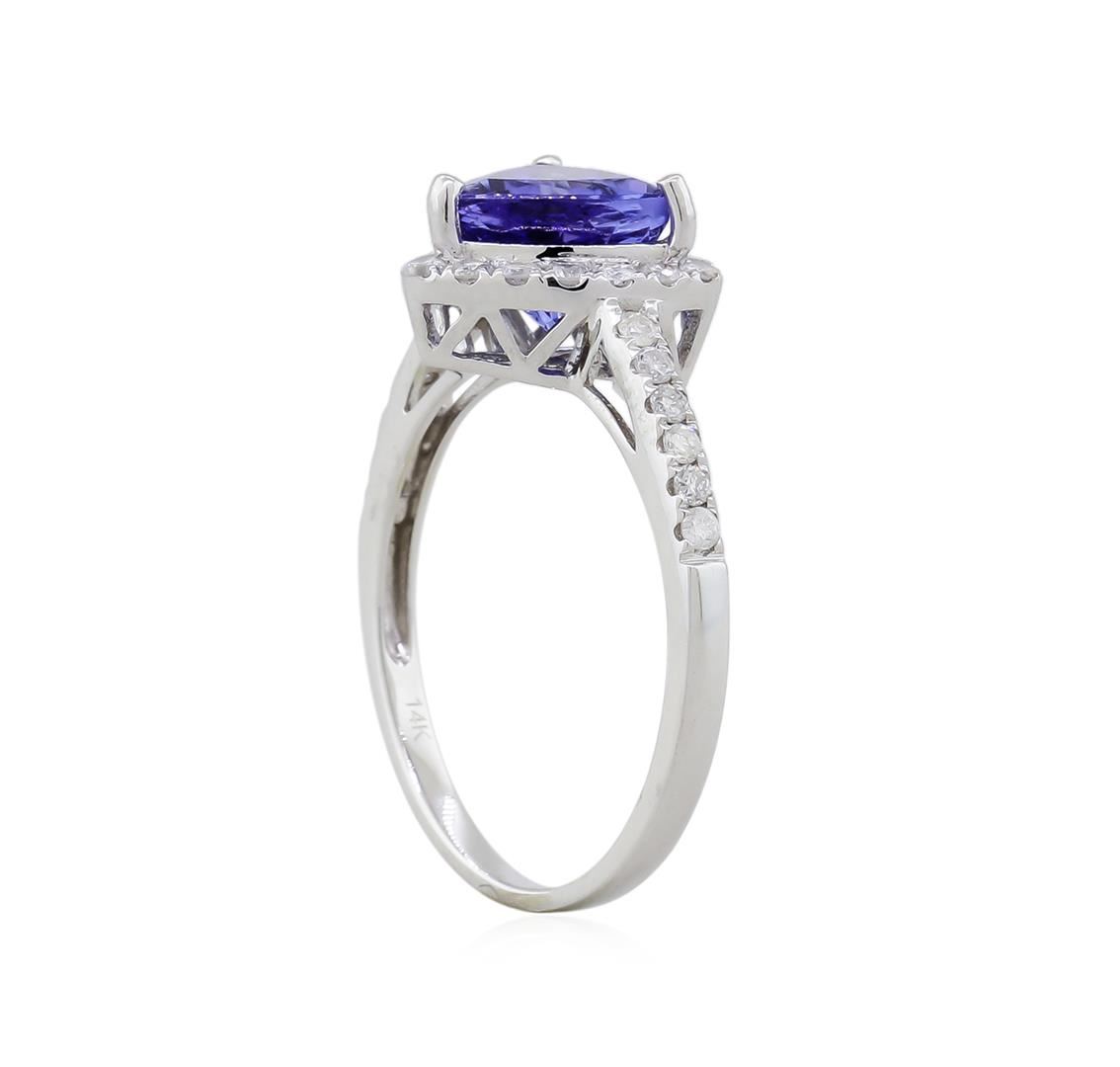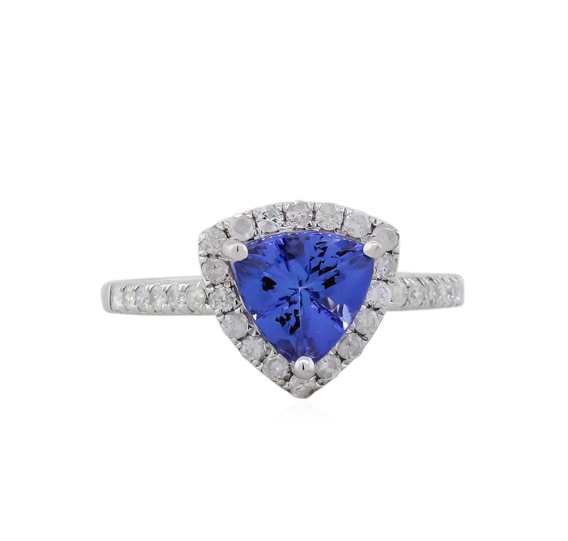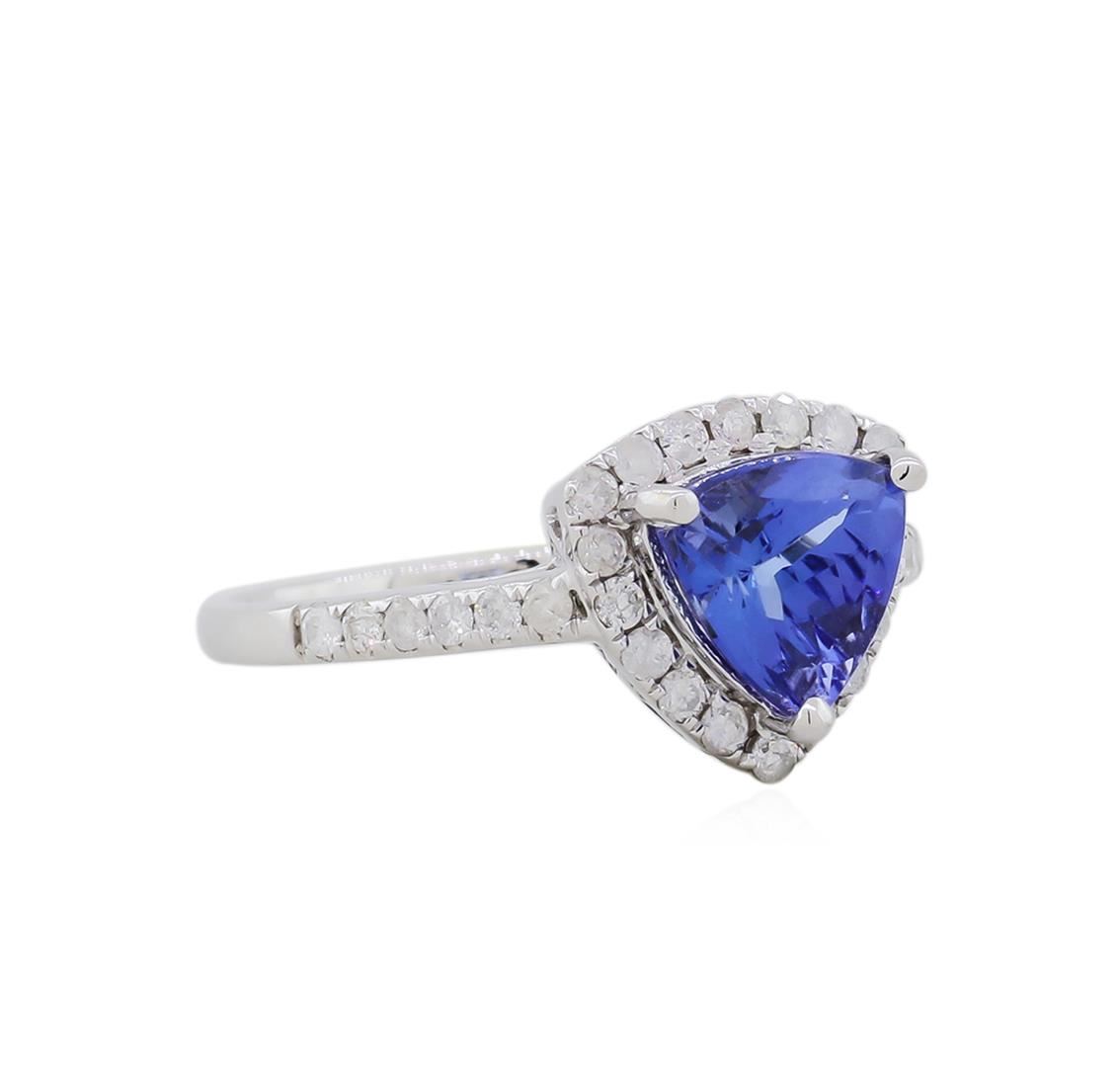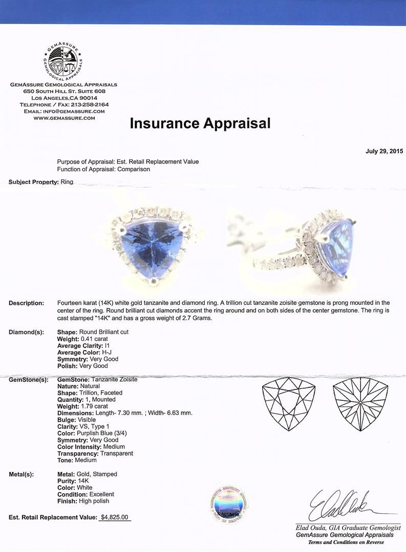 14KT yellow gold tanzanite and diamond ring. A trillion cut tanzanite zoisite gemstone weighing in at an aproximate 1.79 carats is prong mounted in the center of the ring. Approximately 0.41 carats of round brilliant cut diamonds accent the ring around the center gemstones and on both sides. The ring is cast stamped "14K" and has a gross weight of 2.7 grams. The diamonds have an average clarity of I1. Tanzanite color is purplish blue (3/4), clarity is VS (type 1), intensity is medium. Finish: High polish. Condition: Excellent GAS Appraised at $4,825.00.