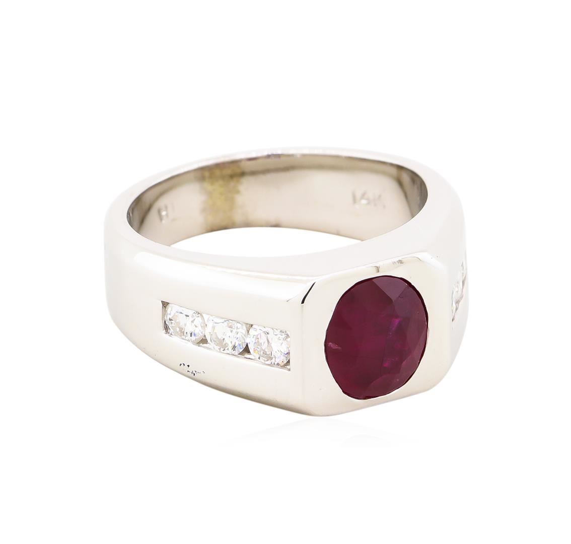 One electronically tested 14KT white gold man's cast fashion ring with a cathedral shank with a bright polish finish. The featured lady's ring has a shank measuring 5.10 millimeters wide. Identified with markings of "14K". Condition is new, good workmanship. Containing: One bezel set oval modified brilliant cut natural ruby, measuring 7.60 x 6.75 x 3.95mm, 5%. bulge factor, approximate weight of 1.80ct., clarity is heavily included, type II, medium dark, moderately strong, red color, (GIA R 6/4), Cut is good. Transmitting light somewhat diffusely, semi-transparent to translucent. Naturally occurring internal & external characteristics are present. Colored gemstones are presumed to have been subjected to commonly used enhancement processes. Graded in the setting. Six channel set round brilliant cut diamonds, measuring 2.10 - 2.00 x 1.27mm (depth est.) approximate. Total Weight of 6 Stones = 0.20ct. Graded in the setting. Clarity: SI-1 to SI-2. Color: G - H, Cut Good. Total Weight of Colored Stones 1.80ct. Total Weight of Diamonds 0.20ct. Total Weight of Ring 11.90gm. GAS Appraised at $6,855.00.