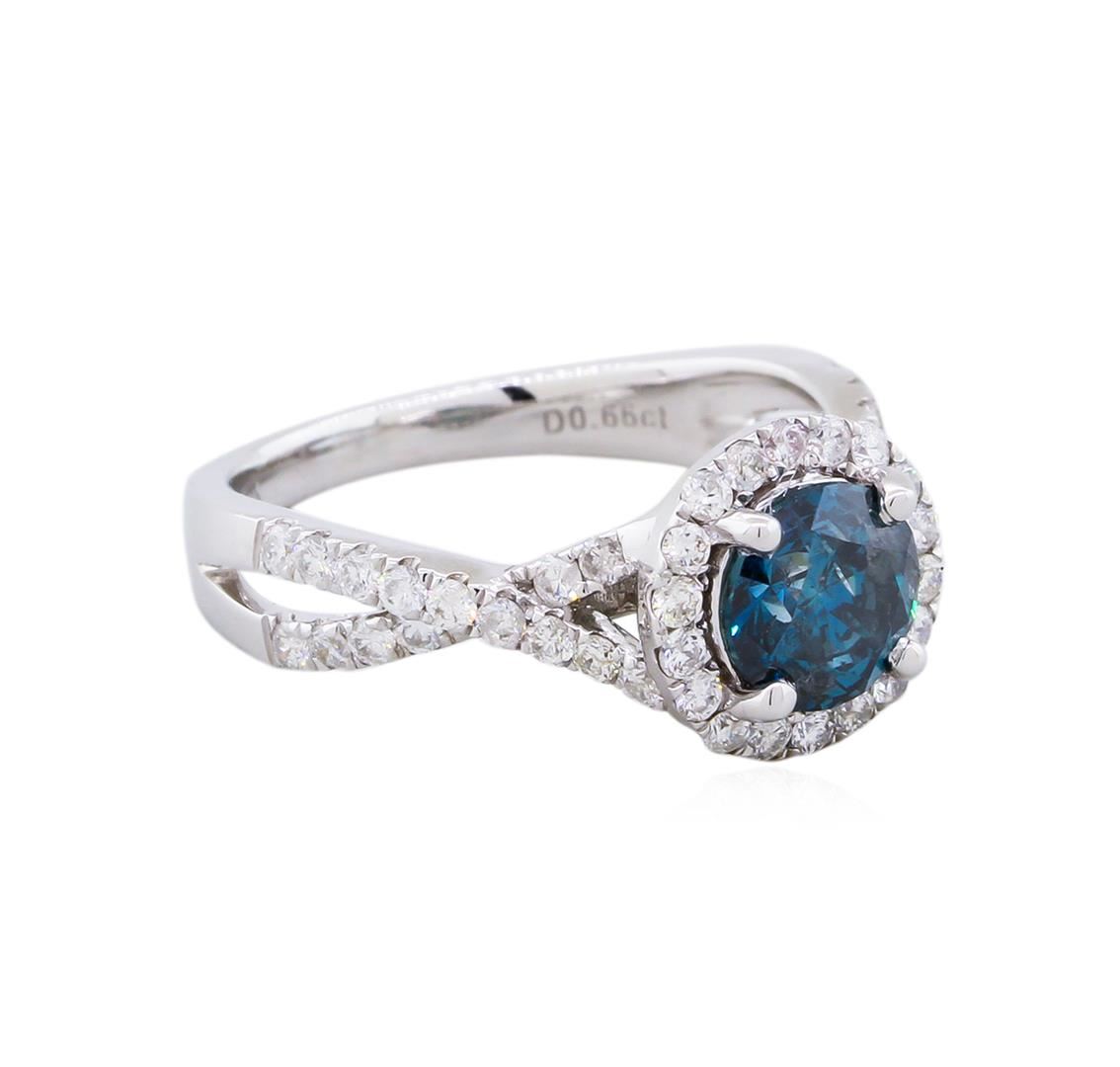 One electronically tested 14KT white gold ladies cast diamond ring with a bright polish finish. The featured green-blue diamond is set within a diamond bezel supported by crossed diamond set shoulders, completed by a two millimeter wide band. Trademark is Orianne. Identified with markings of "14K". Condition is new, good workmanship. Containing: One prong set round brilliant cut diamond, measuring 6.60 - 6.50 x 4.20mm (depth est.), 5.00.%. GTCF approximate weight of 1.17ct. Indications of laboratory irradiated enhanced color. Graded in the setting. Clarity: I-1 Forty-Eight prong set round brilliant cut diamonds approximate. Total Weight of 48 Stones = 0.66ct. Graded in the setting. Clarity: I-1 to I-2. Color: G - I. Total Weight of Diamonds 1.83ct. Total Weight of Ring 3.72gm. AIG Appraised at $10,670.00.