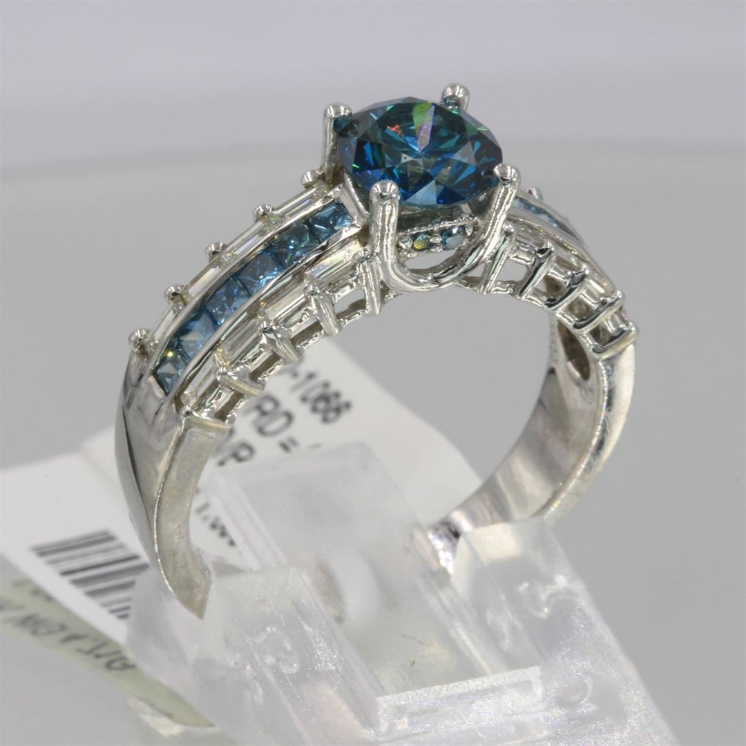 One White Gold Round Fancy Blue Diamond Wedding Engagement Ring. The metal type is 14k white gold. Gross weight is 4.71 grams with a total of 29 stones. Size 7 but can be resized. Condition brand new. Main stone is color enhanced and natural. Main diamond carat is 1.06 carats. Shape is round cut, clarity fine deep, color fancy blue and cut is excellent. Side fancy blue diamond is 0.44 carats. Side diamond shape is princess cut. Clarity is VS / SI1, color fancy blue / I, and cut is excellent. Side white baguette diamond is 0.35 carats. Clarity is SI1 and color is G.