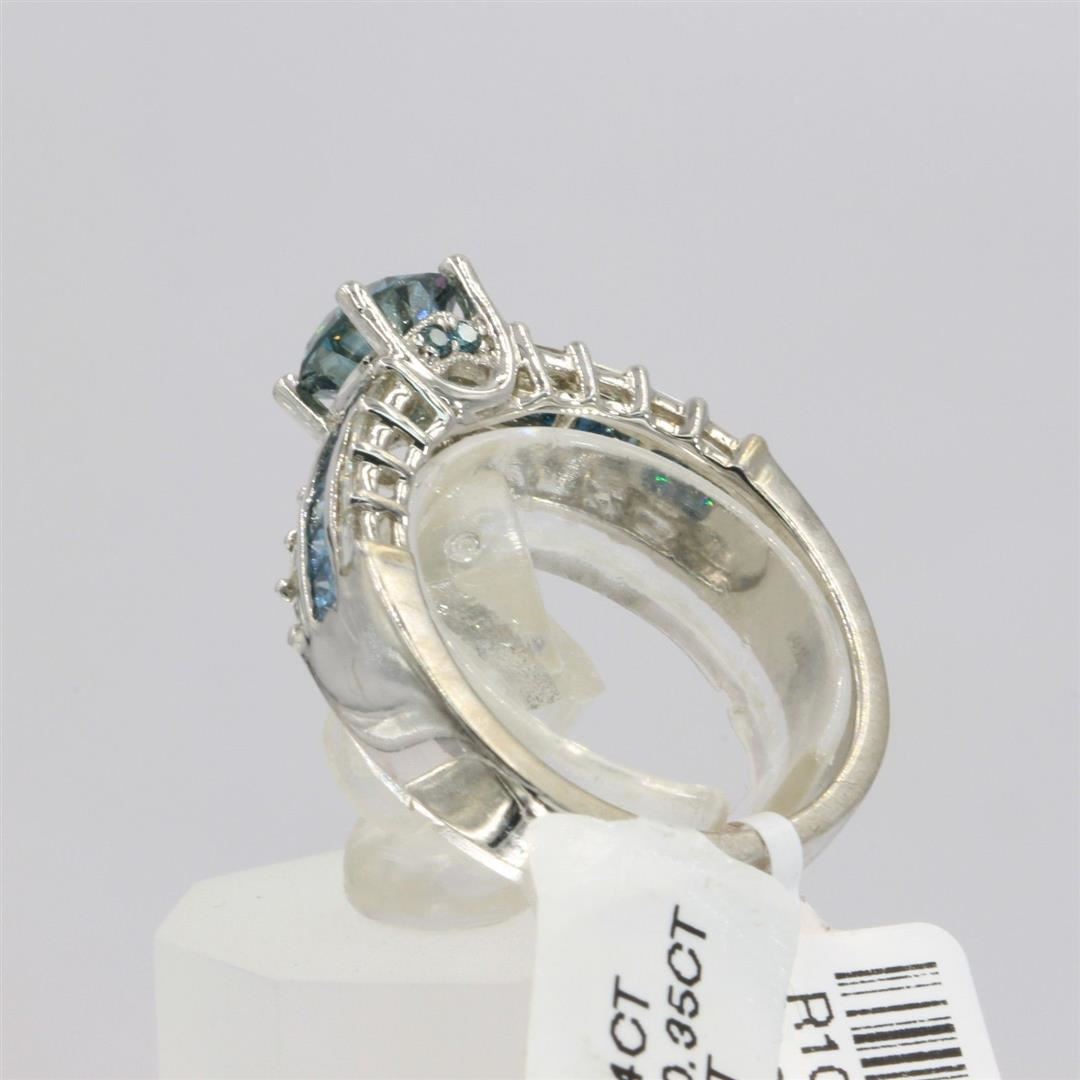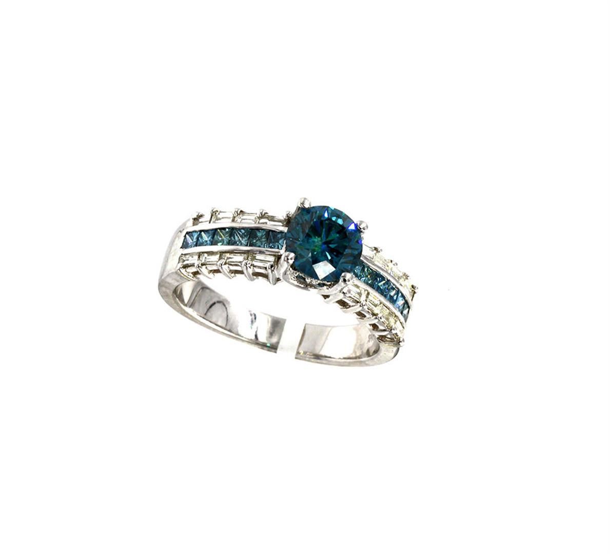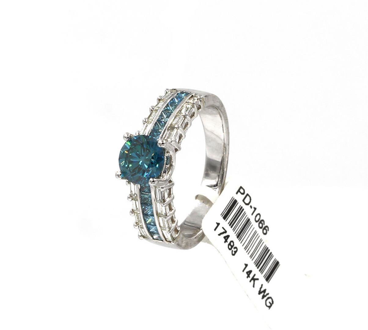 One White Gold Round Fancy Blue Diamond Wedding Engagement Ring. The metal type is 14k white gold. Gross weight is 4.71 grams with a total of 29 stones. Size 7 but can be resized. Condition brand new. Main stone is color enhanced and natural. Main diamond carat is 1.06 carats. Shape is round cut, clarity fine deep, color fancy blue and cut is excellent. Side fancy blue diamond is 0.44 carats. Side diamond shape is princess cut. Clarity is VS / SI1, color fancy blue / I, and cut is excellent. Side white baguette diamond is 0.35 carats. Clarity is SI1 and color is G.