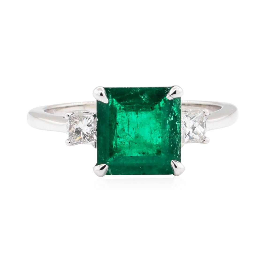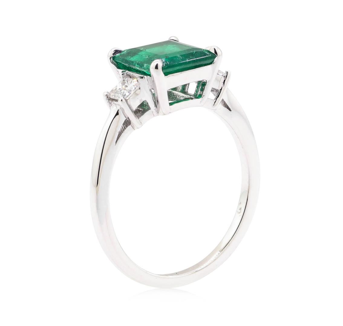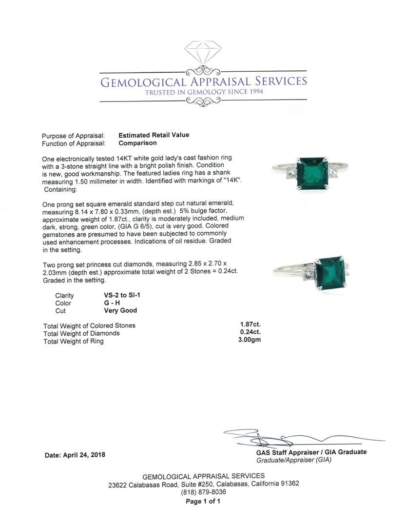 One electronically tested 14KT white gold Ladies cast fashion ring with a 3-stone straight line with a bright polish finish. The featured ladies ring has a shank measuring 1.50 millimeter in width. Identified with markings of '14K'. Condition is new, good workmanship. Containing: One prong set square emerald standard step cut natural emerald, measuring 8.14 x 7.80 x 0.33mm, (depth est.) 5%. bulge factor, approximate weight of 1.87ct., clarity is moderately included, medium dark, strong, green color, (GIA G 6/5), cut is very good. Colored gemstones are presumed to have been subjected to commonly used enhancement processes. Indications of oil residue. Graded in the setting. Two prong set princess cut diamonds, measuring 2.85 x 2.70 x 2.03mm (depth est.) approximate total weight of 2 Stones = 0.24ct. Graded in the setting. Color G - H Clarity VS-2 to SI-1 Cut Very Good. Total Weight of Colored Stones 1.87ct.. Total Weight of Diamonds 0.24ct.. Total Weight of Ring 3.00gm. GAS Appraised.